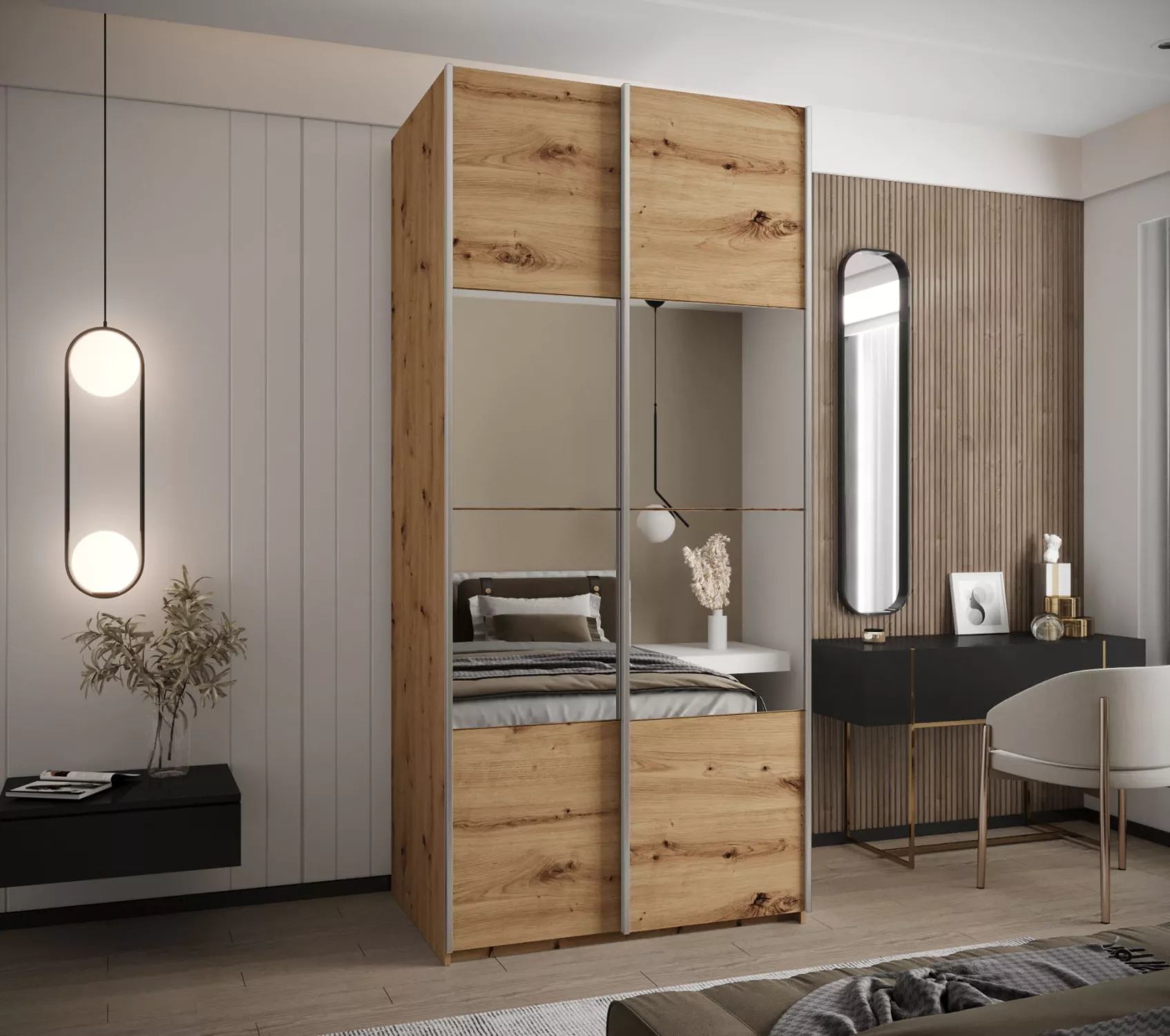 Dvoudveřová skříň SAMARA 4 představuje spojení elegance a funkcionality. Nabízí dostatek úložného prostoru v podobě policového systému a 2 šatních tyčí.