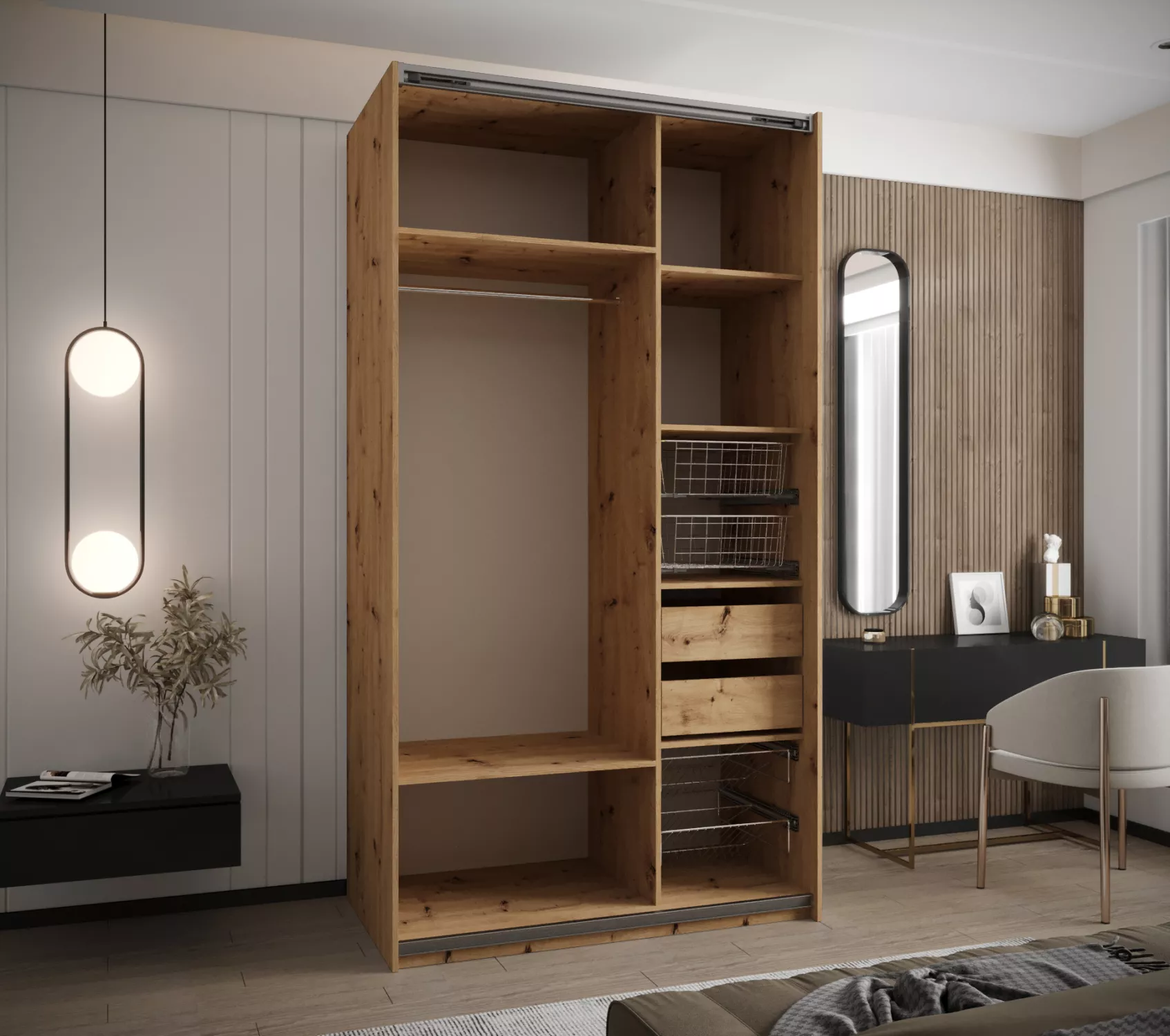 Dvoudveřová skříň SAMARA 4 představuje spojení elegance a funkcionality. Nabízí dostatek úložného prostoru v podobě policového systému a 2 šatních tyčí.