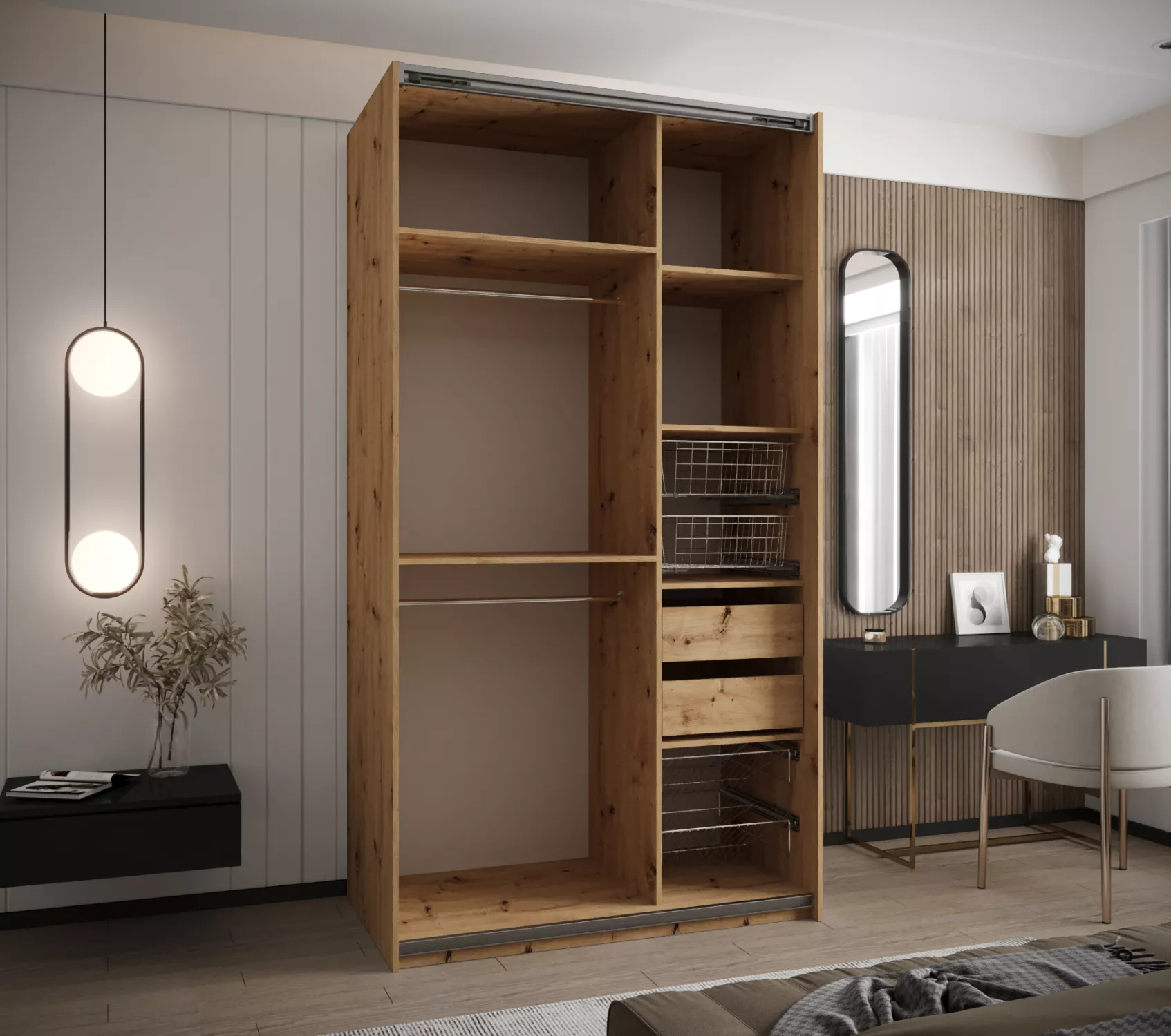 Dvoudveřová skříň SAMARA 4 představuje spojení elegance a funkcionality. Nabízí dostatek úložného prostoru v podobě policového systému a 2 šatních tyčí.