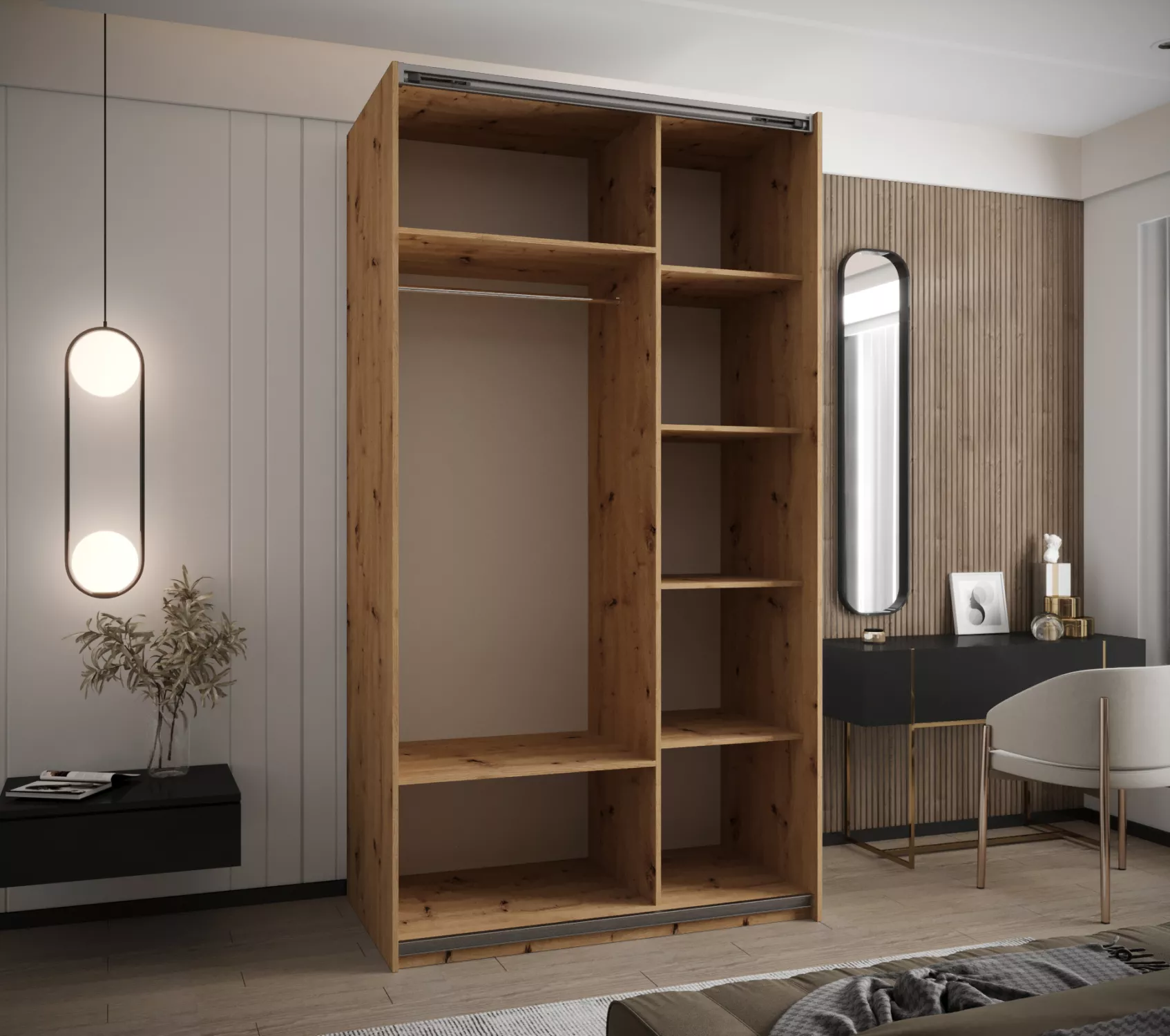 Dvoudveřová skříň SAMARA 4 představuje spojení elegance a funkcionality. Nabízí dostatek úložného prostoru v podobě policového systému a 2 šatních tyčí.