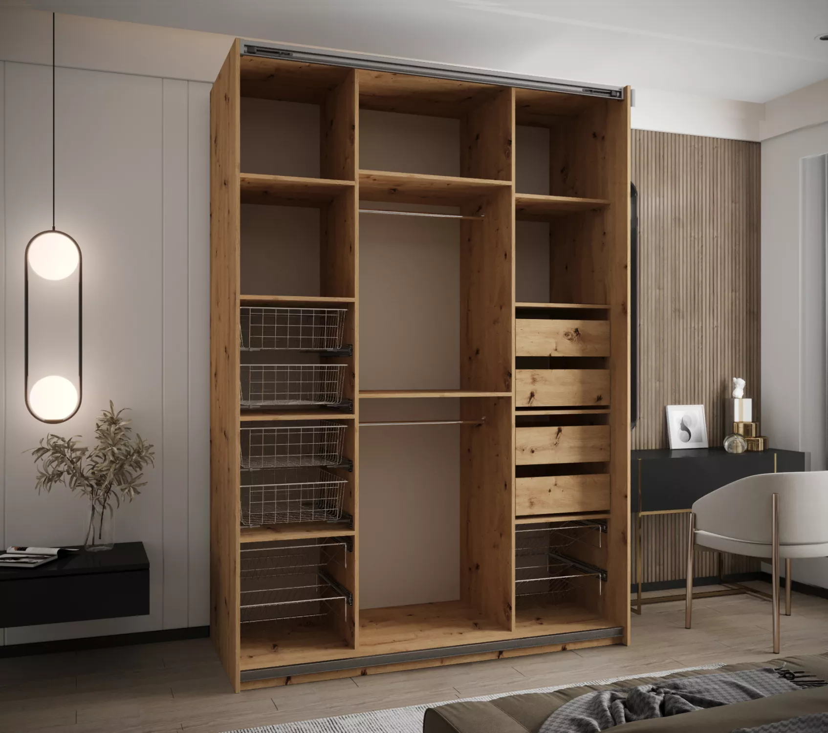 Dvoudveřová skříň SAMARA 4 představuje spojení elegance a funkcionality. Nabízí dostatek úložného prostoru v podobě policového systému a 2 šatních tyčí.