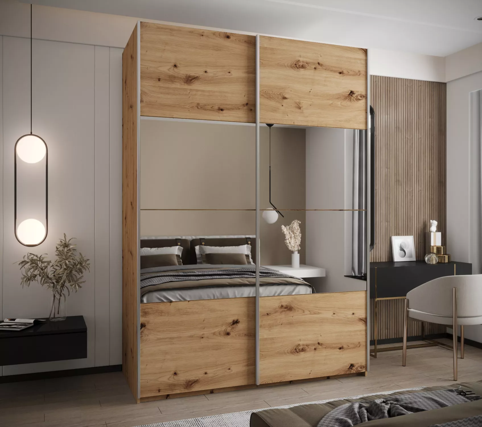Dvoudveřová skříň SAMARA 4 představuje spojení elegance a funkcionality. Nabízí dostatek úložného prostoru v podobě policového systému a 2 šatních tyčí.