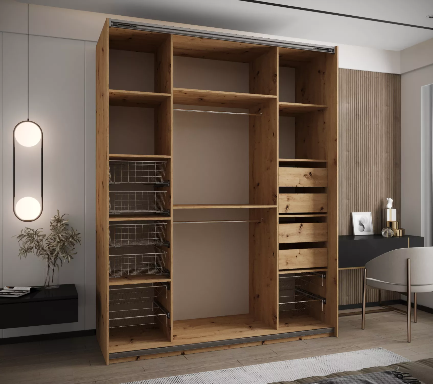 Přídavné police do skříně, šuplíky, drátěný košík a košík na boty najdete k dokoupení v sekci Doporučujeme přikoupit. Do skříně je možné nainstalovat 1 nebo 2 police a maximálně 8 setu šuplíků.