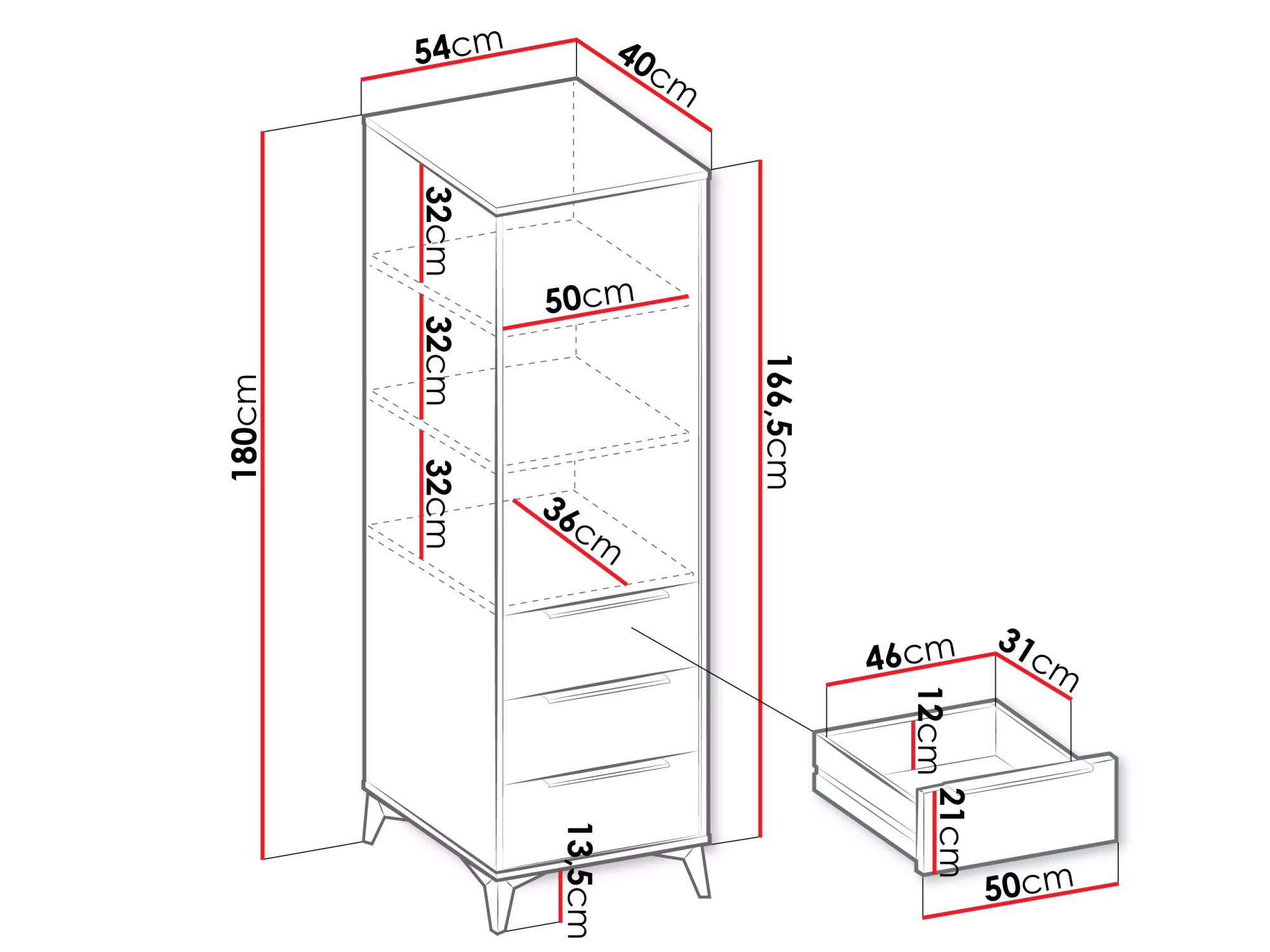 S úzkou šatní skříní XELA snadno udržíte svůj šatník v perfektním pořádku, a zároveň dodáte svému interiéru luxusní vzhled. Ve spodní části šatní skříně jsou 3 snadno přístupné zásuvky na spodní prádlo či doplňky. Uvnitř naleznete několik prostorných polic.