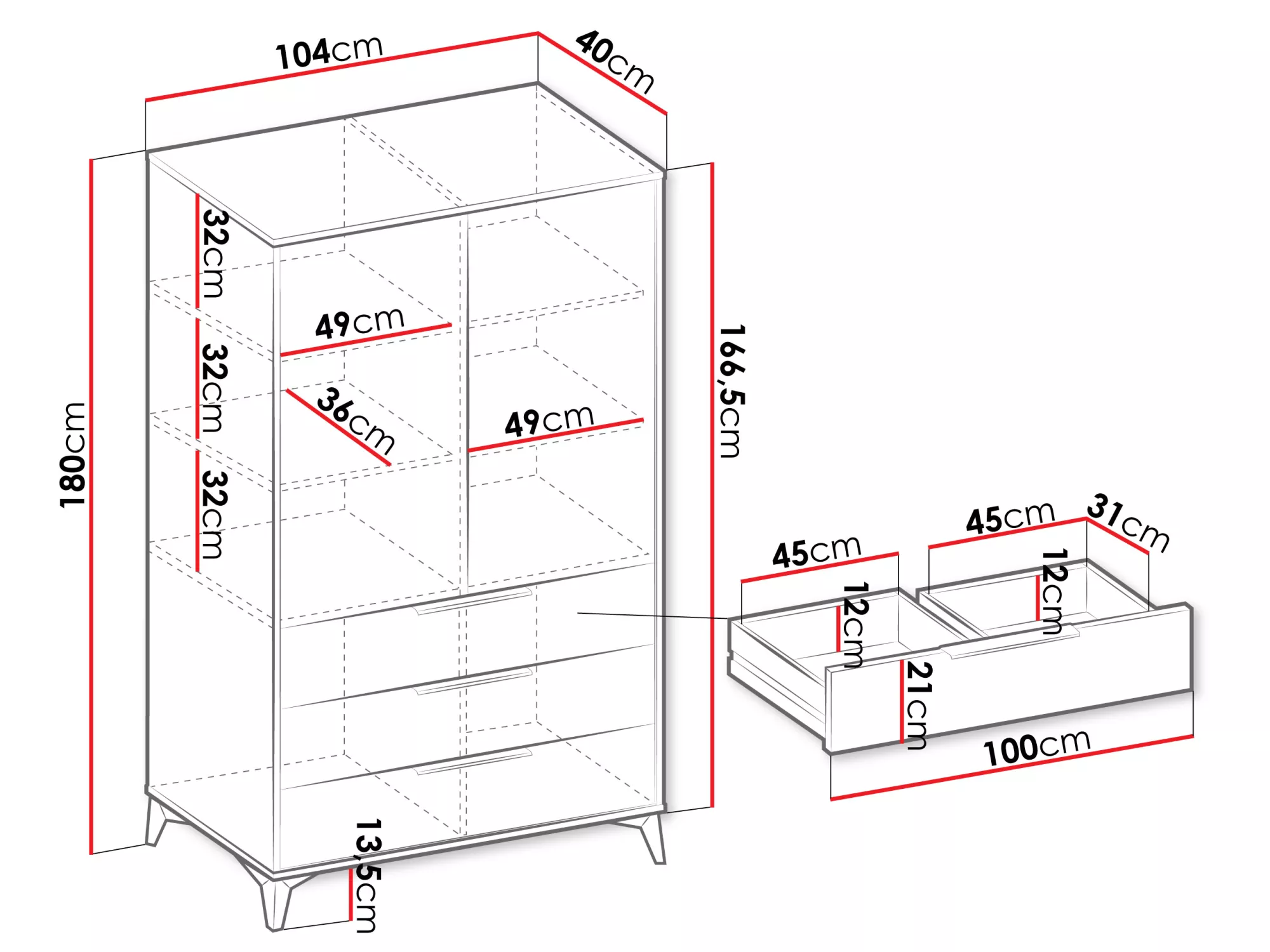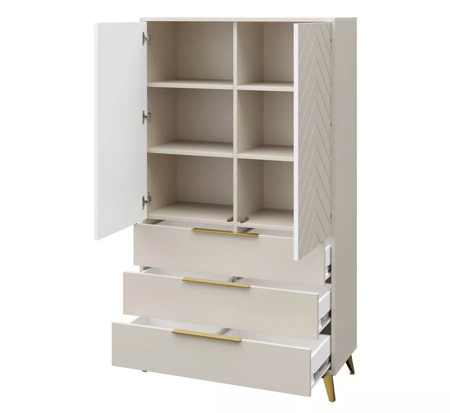 Se šatní skříní XELA snadno udržíte svůj šatník v perfektním pořádku, a zároveň dodáte svému interiéru luxusní vzhled. Ve spodní části šatní skříně jsou 3 snadno přístupné zásuvky na spodní prádlo či doplňky. Uvnitř naleznete několik prostorných polic.