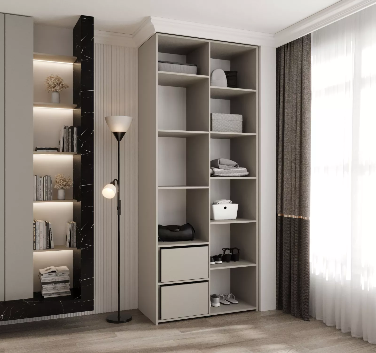 Přídavné šuplíky (včetně pojezdů) a přídavné police vyobrazené na fotografii najdete k dokoupení v sekci Doporučujeme přikoupit. Do skříně je možné nainstalovat 1 set přídavných šuplíků a 1 sadu přídavných polic.