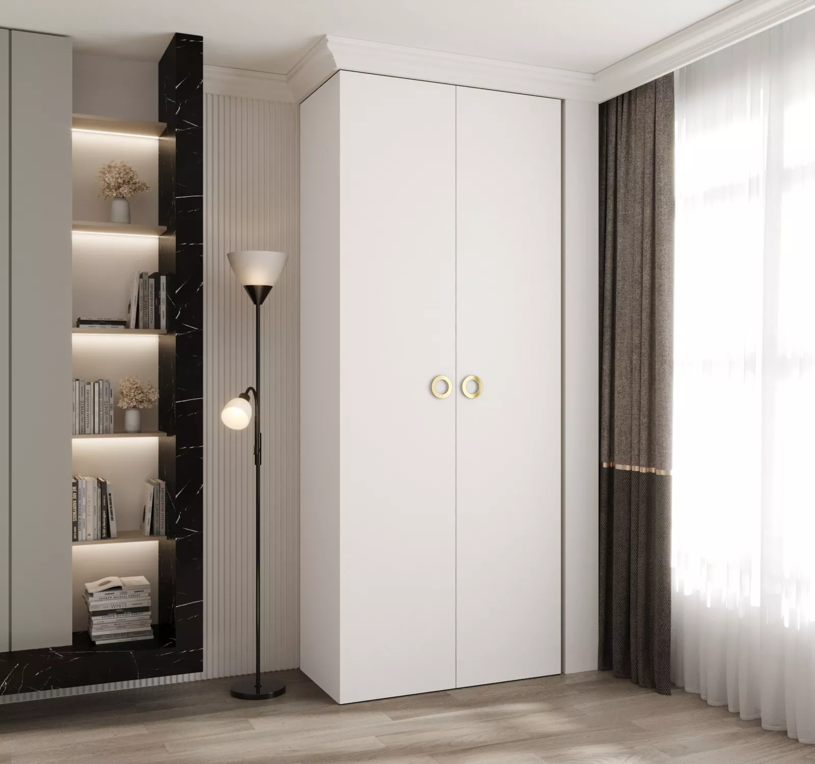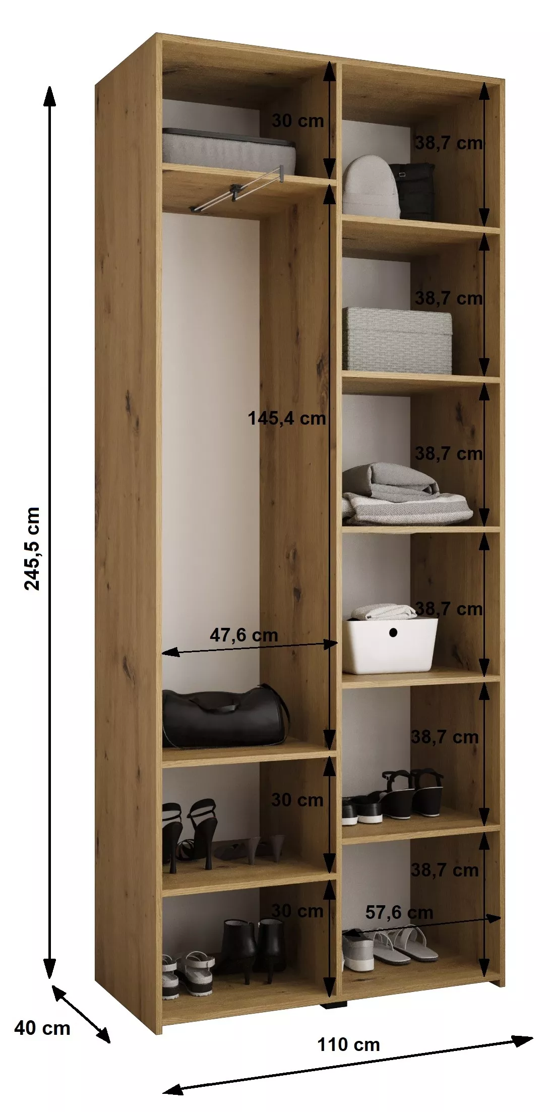 Šatní skříň s policemi LORENA se pyšní svou výškou a menší hloubkou. Využijete tak i malý prostor na maximum. Vnitřní uspořádání je tvořeno policemi a výsuvnou šatní tyčí. Praktickou součástí dvířek jsou decentní úchyty.