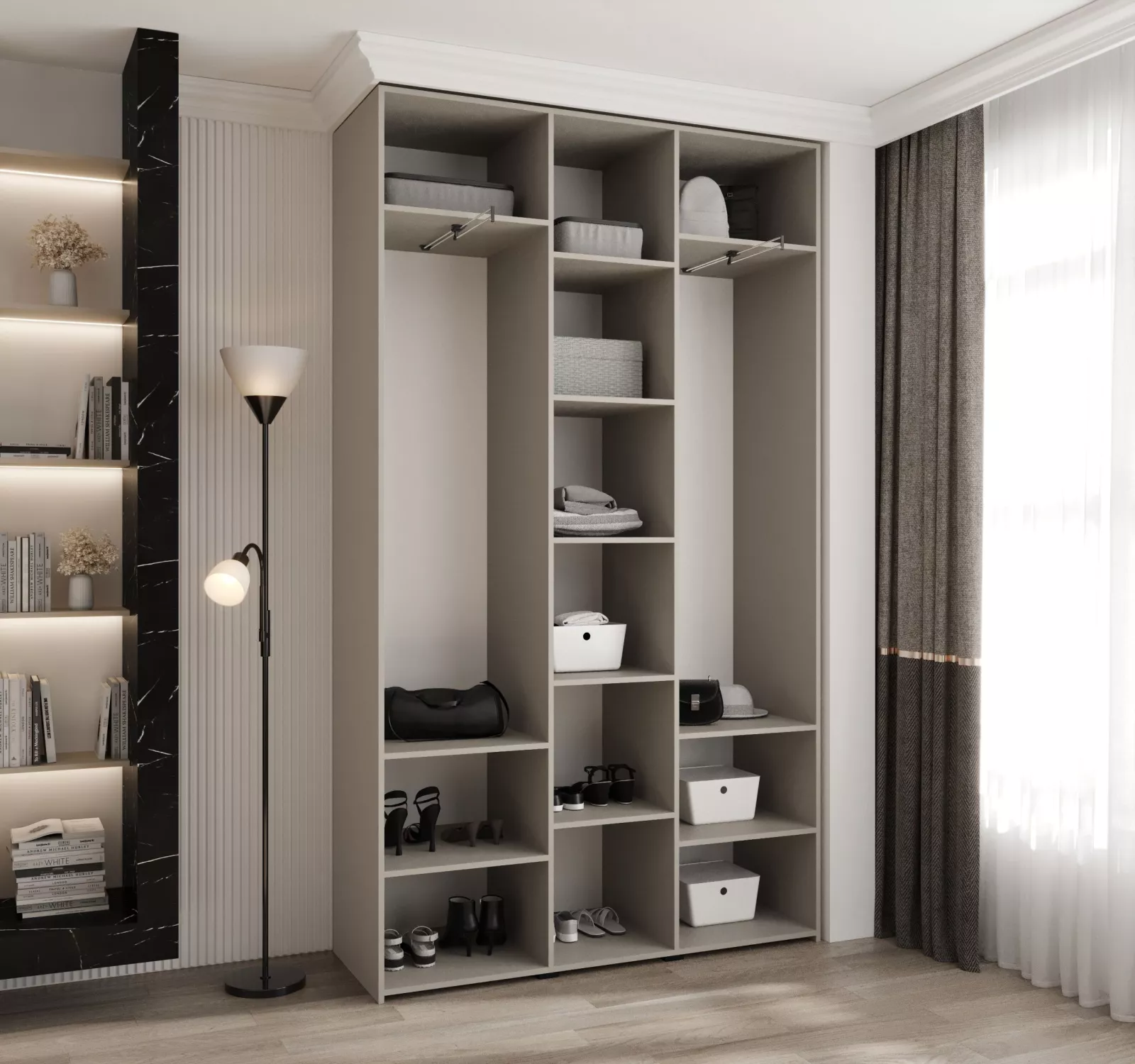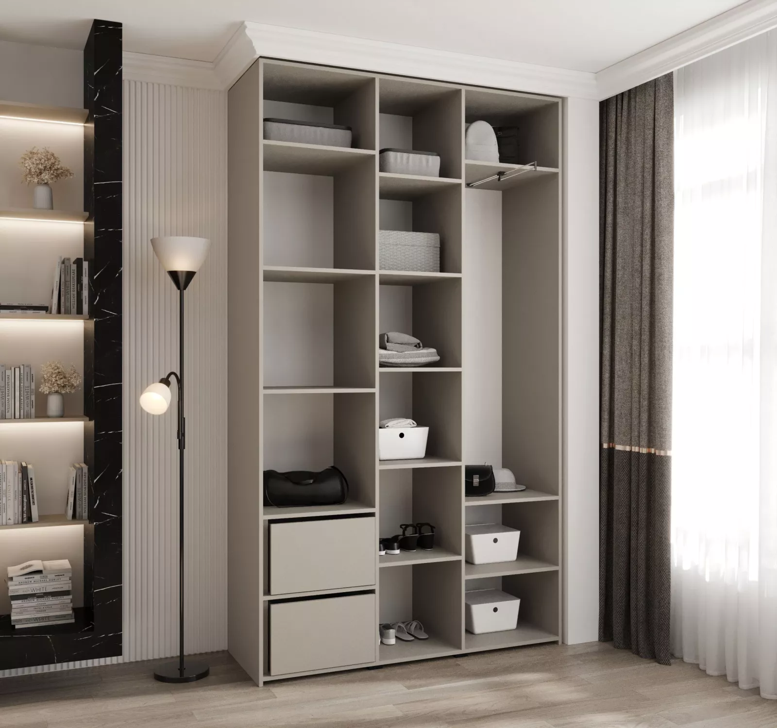 Přídavné šuplíky (včetně pojezdů) a přídavné police vyobrazené na fotografii najdete k dokoupení v sekci Doporučujeme přikoupit. Do skříně je možné nainstalovat 2 sety přídavných šuplíků a 2 sady přídavných polic.