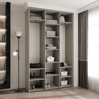 Přídavné šuplíky (včetně pojezdů) a přídavné police vyobrazené na fotografii najdete k dokoupení v sekci Doporučujeme přikoupit. Do skříně je možné nainstalovat 2 sety přídavných šuplíků a 2 sady přídavných polic.