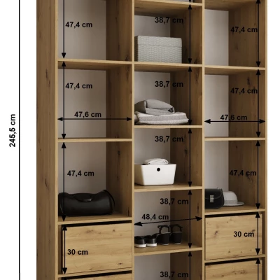 Šatní skříň s policemi LORENA se pyšní svou výškou a menší hloubkou. Využijete tak i malý prostor na maximum. Vnitřní uspořádání je tvořeno policemi a 2 výsuvnými šatními tyčemi. Praktickou součástí dvířek jsou decentní úchyty.