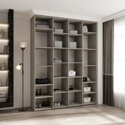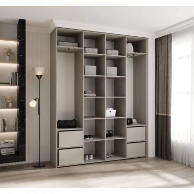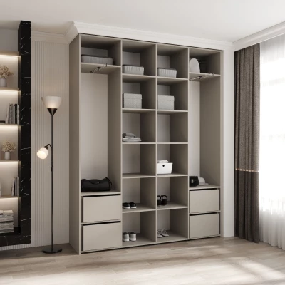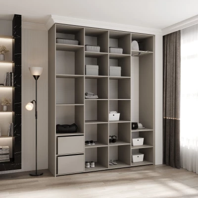 Přídavné šuplíky (včetně pojezdů) a přídavné police vyobrazené na fotografii najdete k dokoupení v sekci Doporučujeme přikoupit. Do skříně je možné nainstalovat 2 sety přídavných šuplíků a 2 sady přídavných polic.
