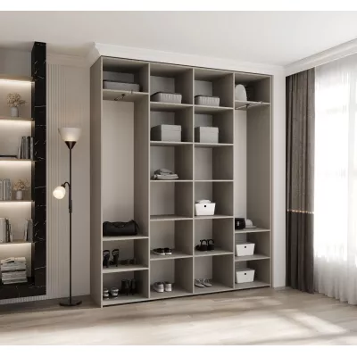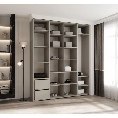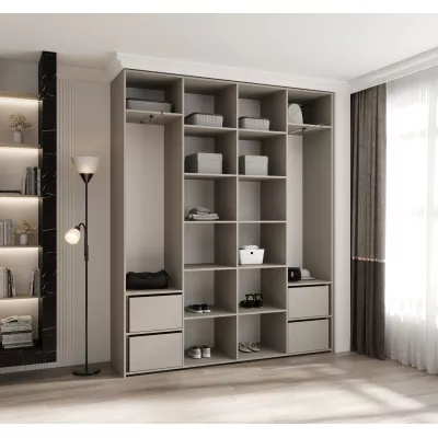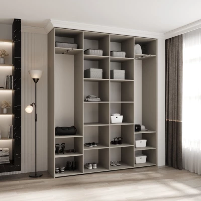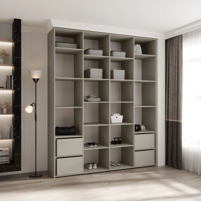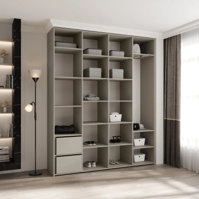 Přídavné šuplíky (včetně pojezdů) a přídavné police vyobrazené na fotografii najdete k dokoupení v sekci Doporučujeme přikoupit. Do skříně je možné nainstalovat 2 sety přídavných šuplíků a 2 sady přídavných polic.