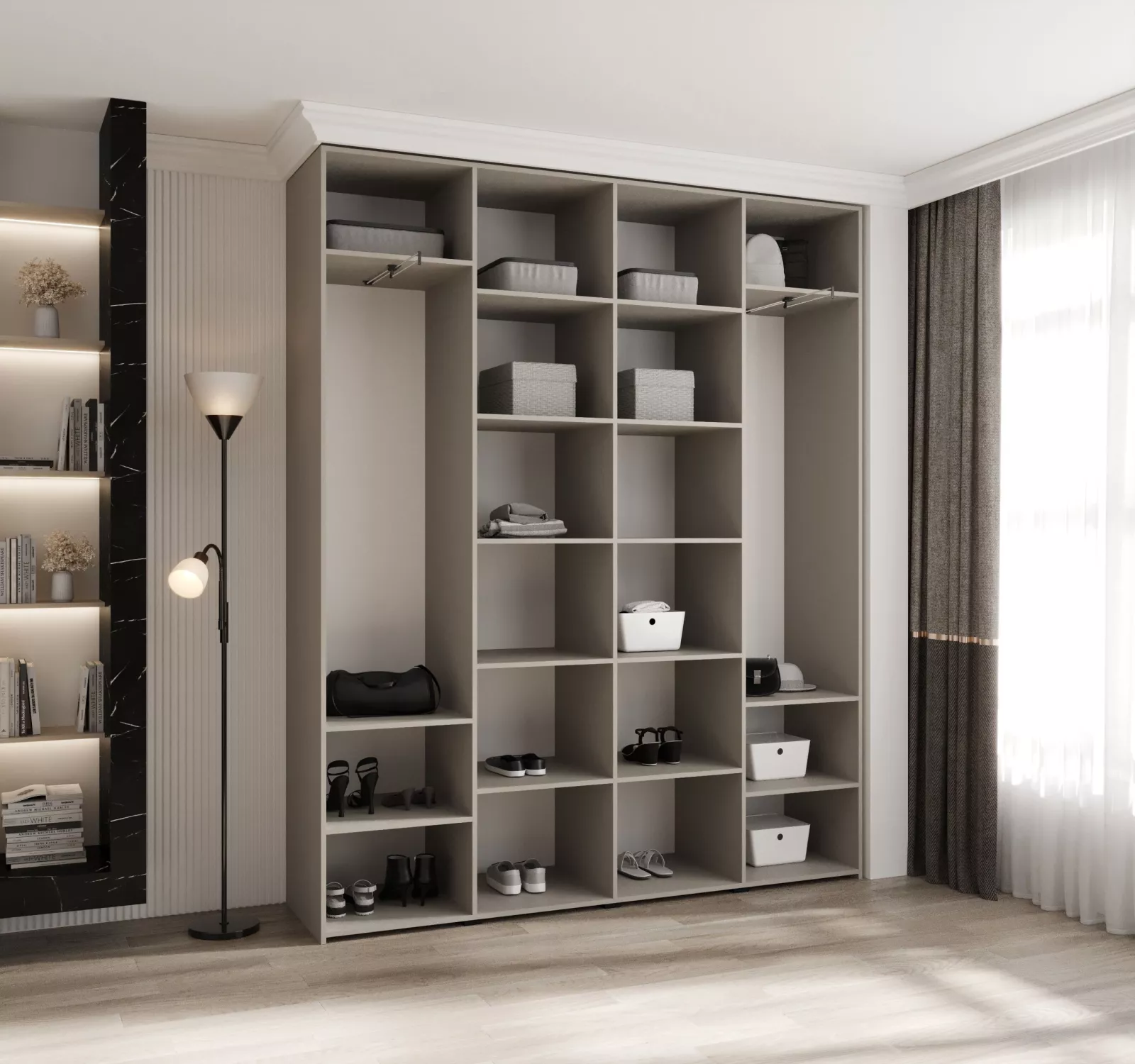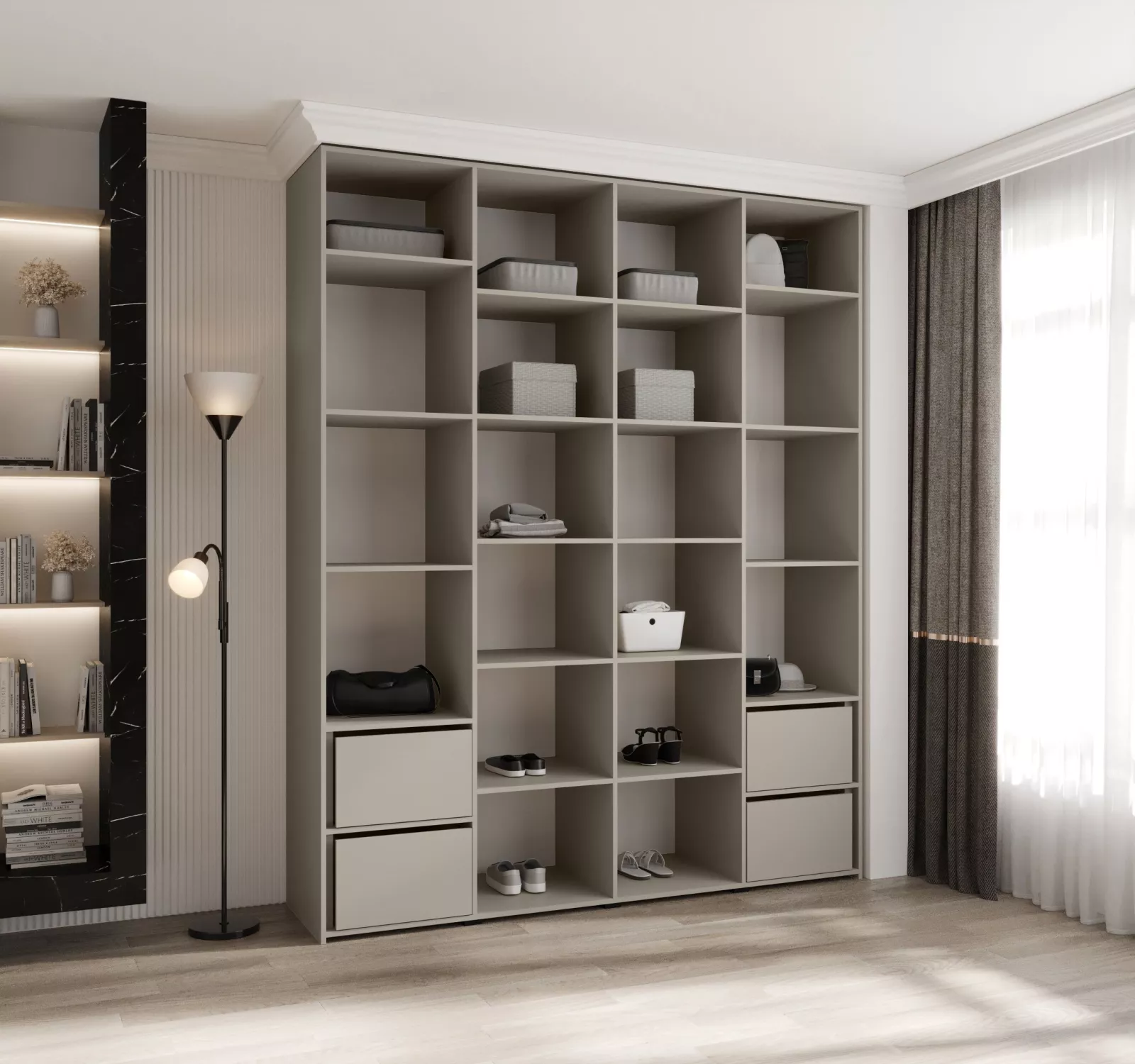 Šuplíky a poličky vyobrazené na fotografii dokoupíte v sekci „Doporučujeme přikoupit“. Pořídíte je v setu po 2 kusech včetně vodících lišt (pojezdů). Do skříně je možné nainstalovat 2 sety šuplíků a 2 sady poliček.