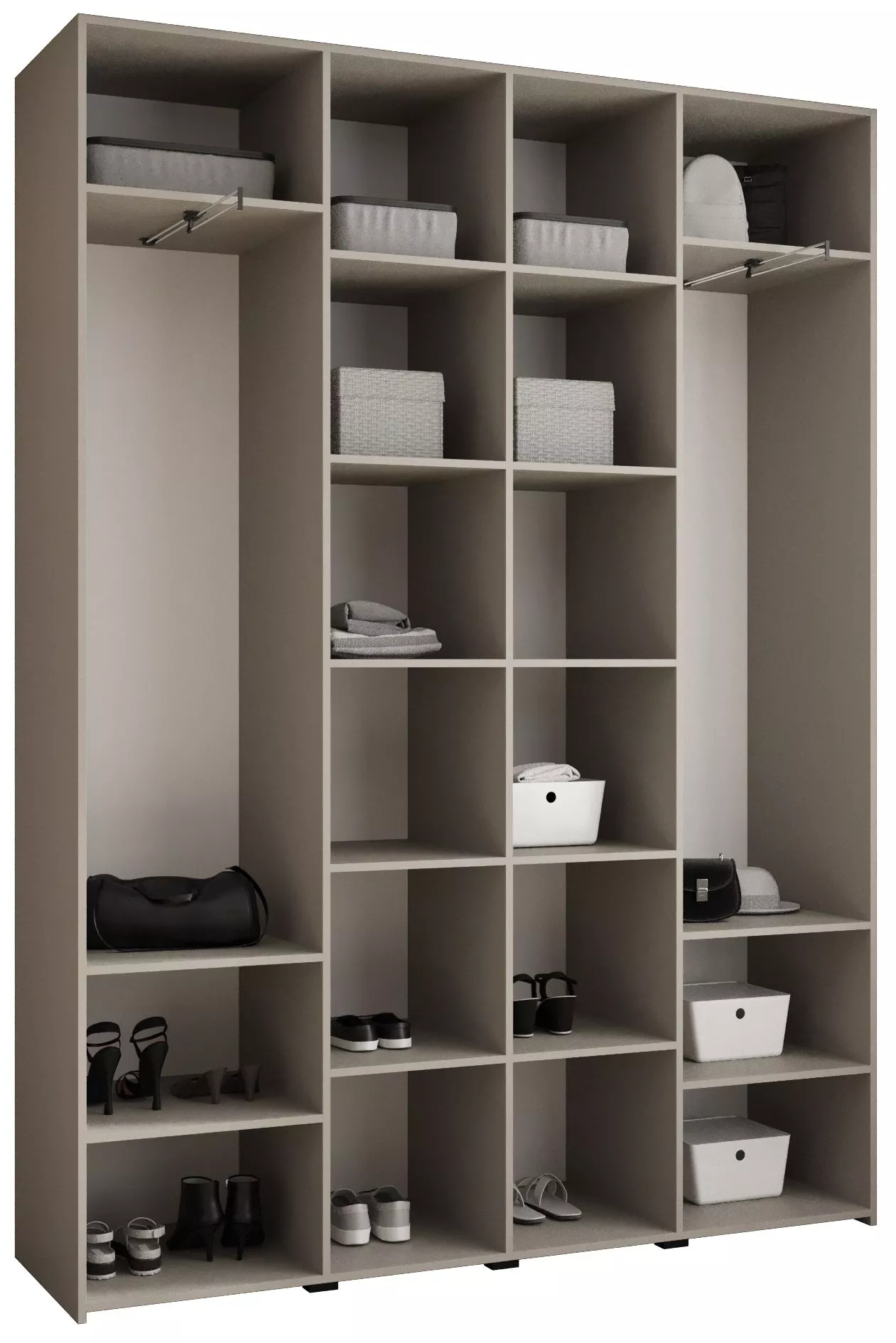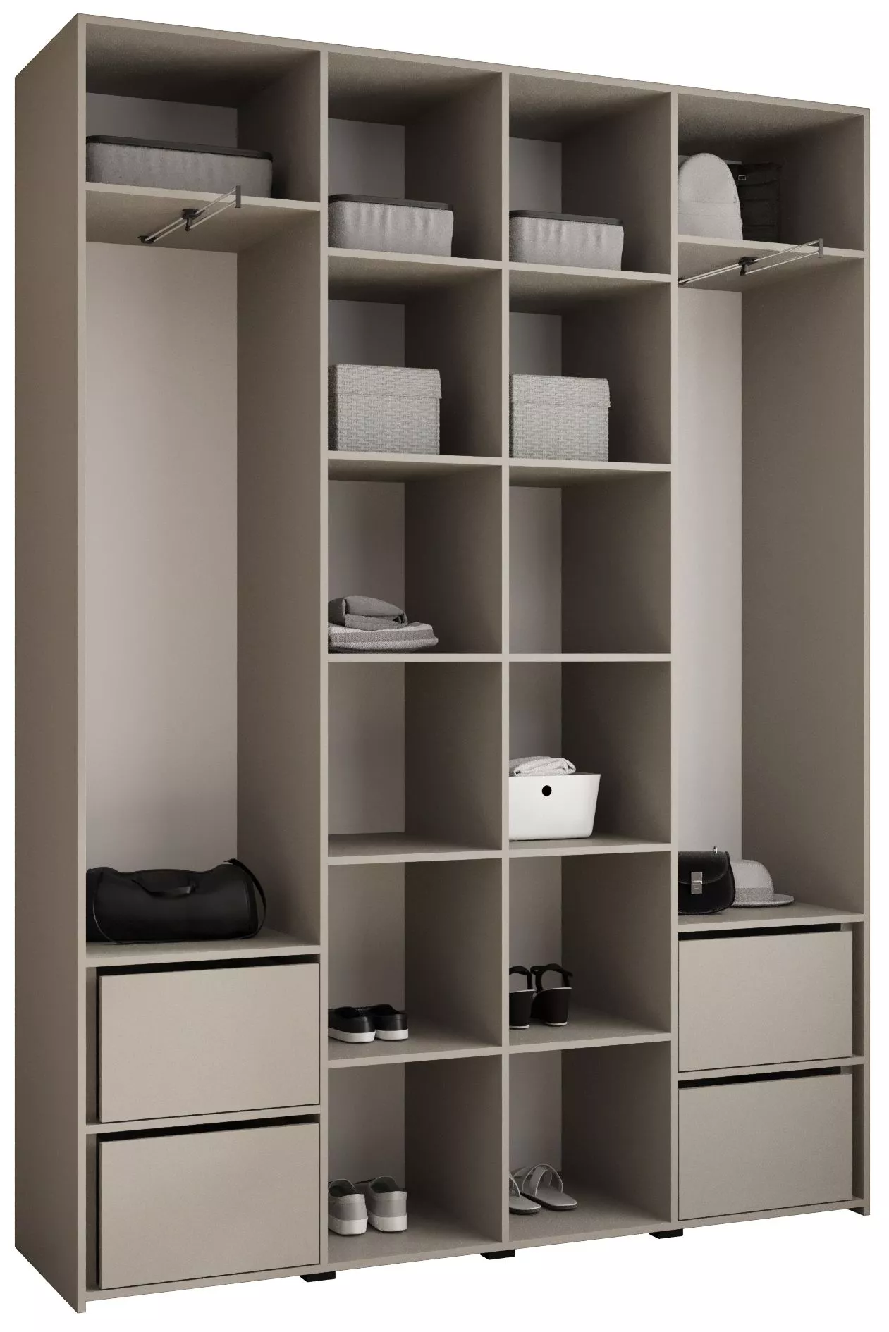 Přídavné šuplíky (včetně pojezdů) a přídavné police vyobrazené na fotografii najdete k dokoupení v sekci Doporučujeme přikoupit. Do skříně je možné nainstalovat 2 sety přídavných šuplíků a 2 sady přídavných polic.