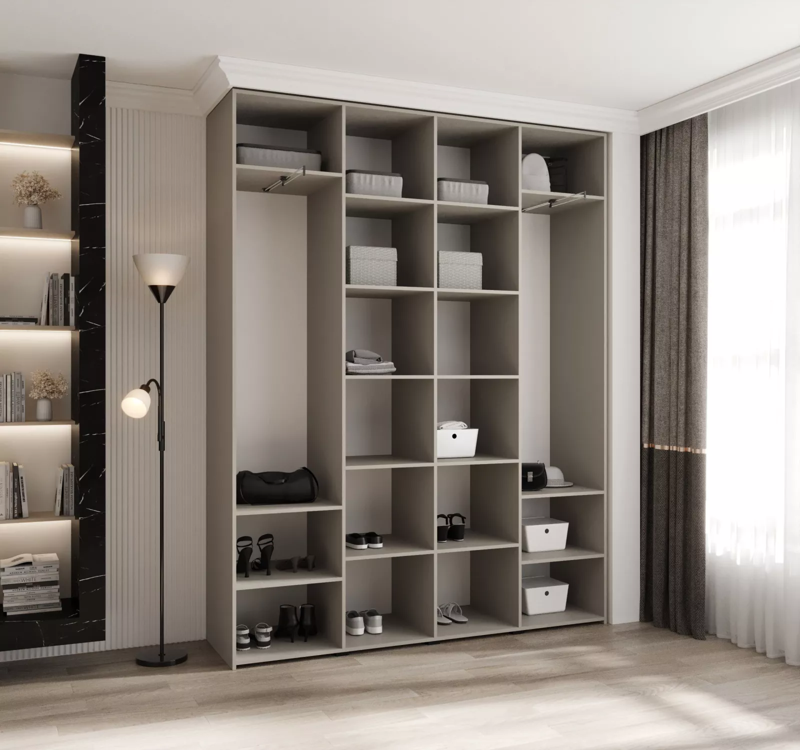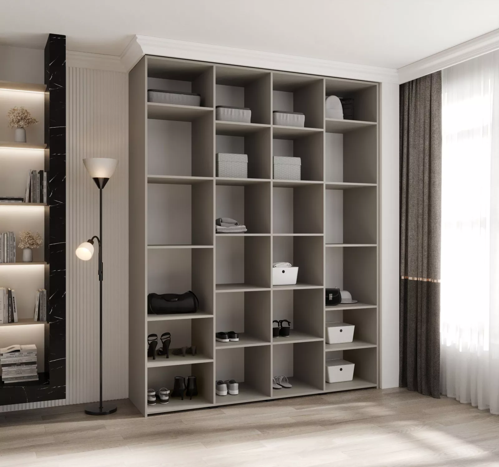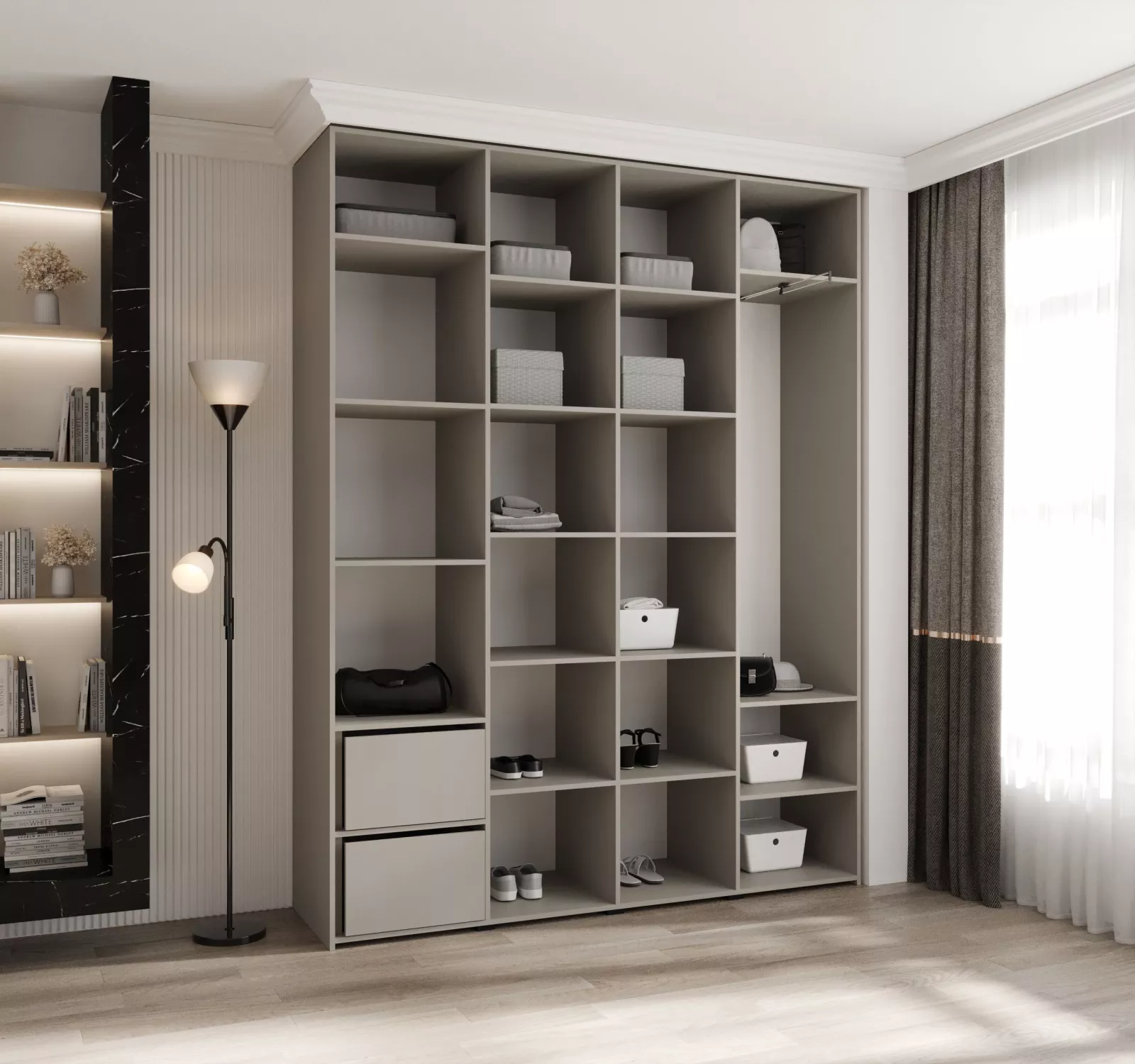 Přídavné šuplíky (včetně pojezdů) a přídavné police vyobrazené na fotografii najdete k dokoupení v sekci Doporučujeme přikoupit. Do skříně je možné nainstalovat 2 sety přídavných šuplíků a 2 sady přídavných polic.