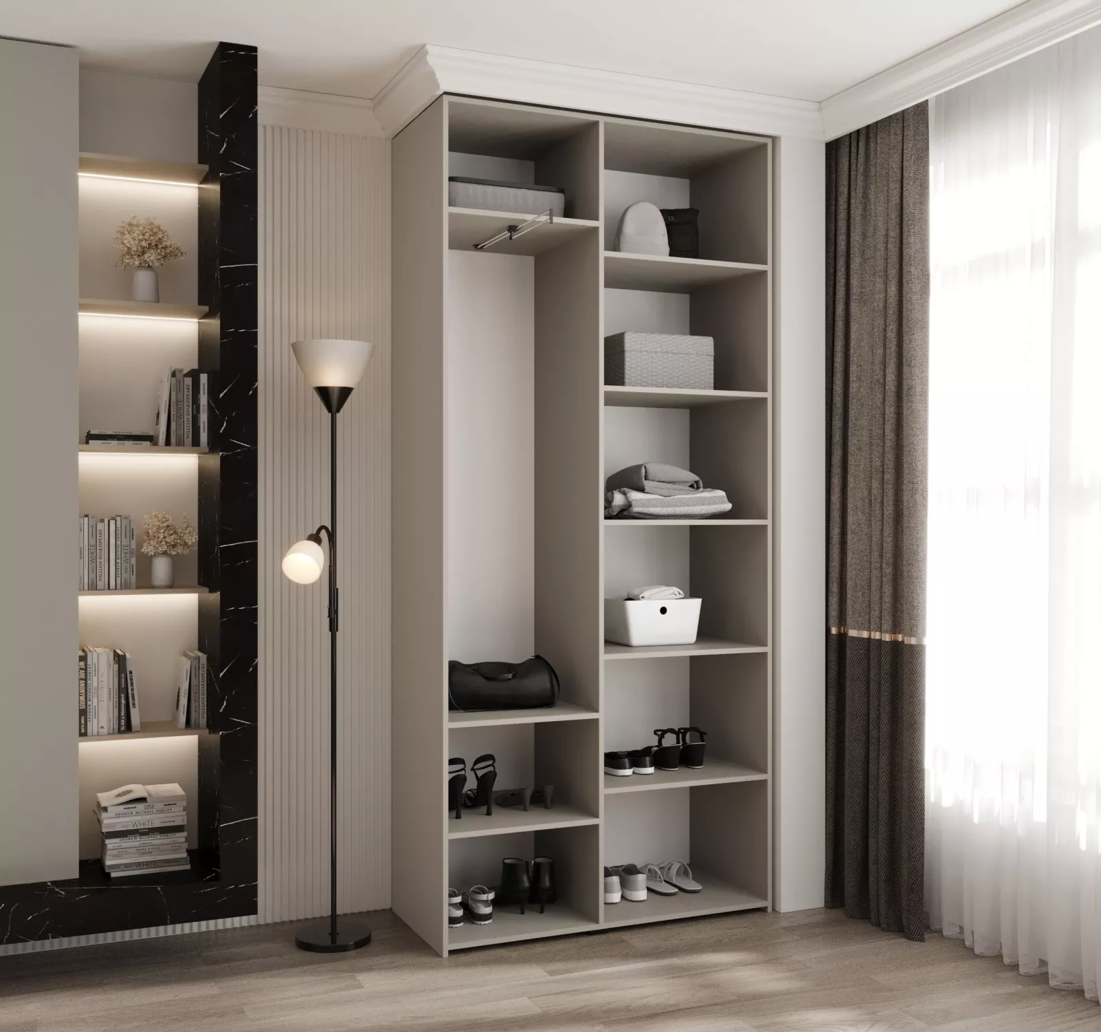 Přídavné šuplíky (včetně pojezdů) a přídavné police vyobrazené na fotografii najdete k dokoupení v sekci Doporučujeme přikoupit. Do skříně je možné nainstalovat 1 set přídavných šuplíků a 1 sadu přídavných polic.