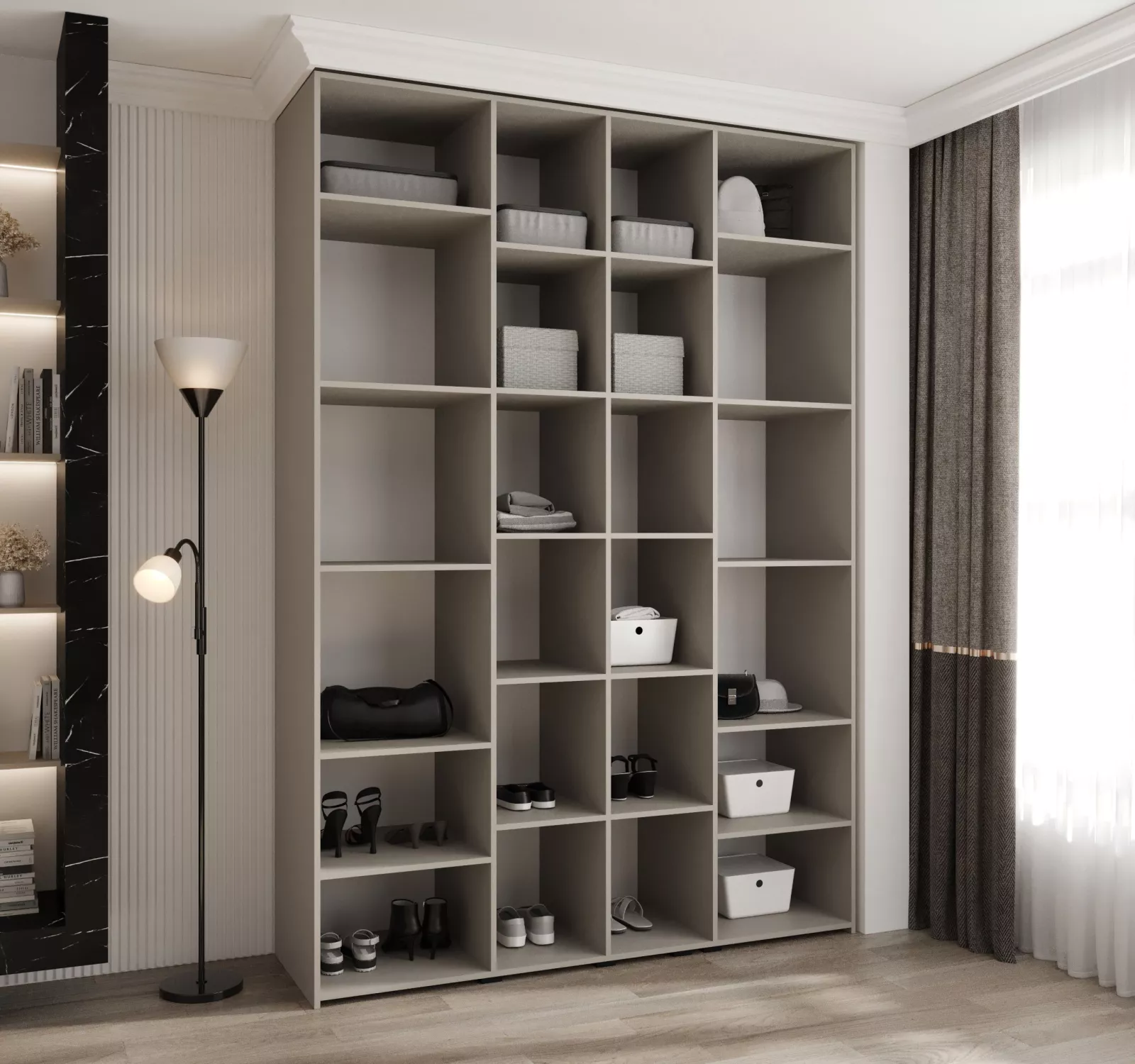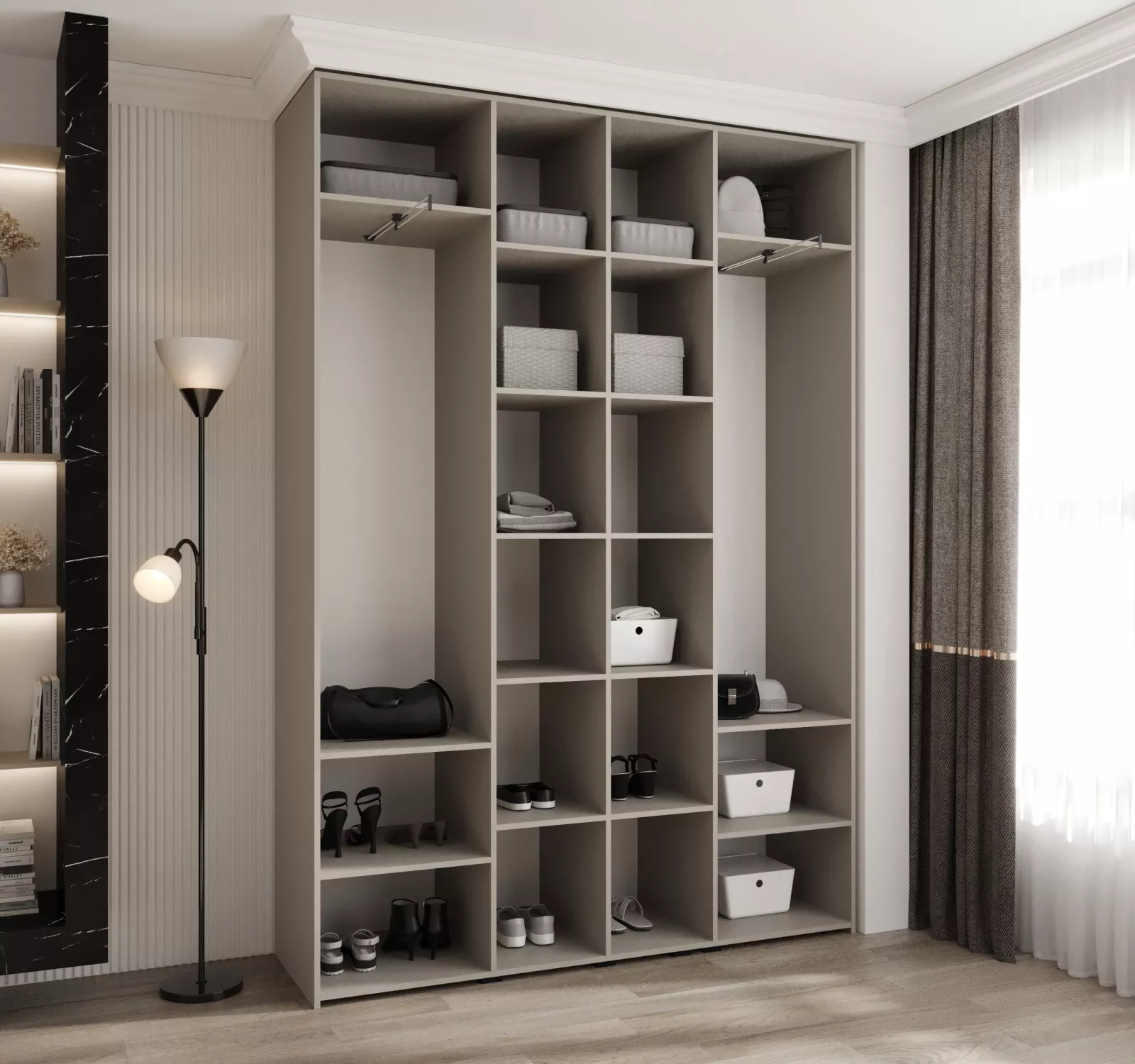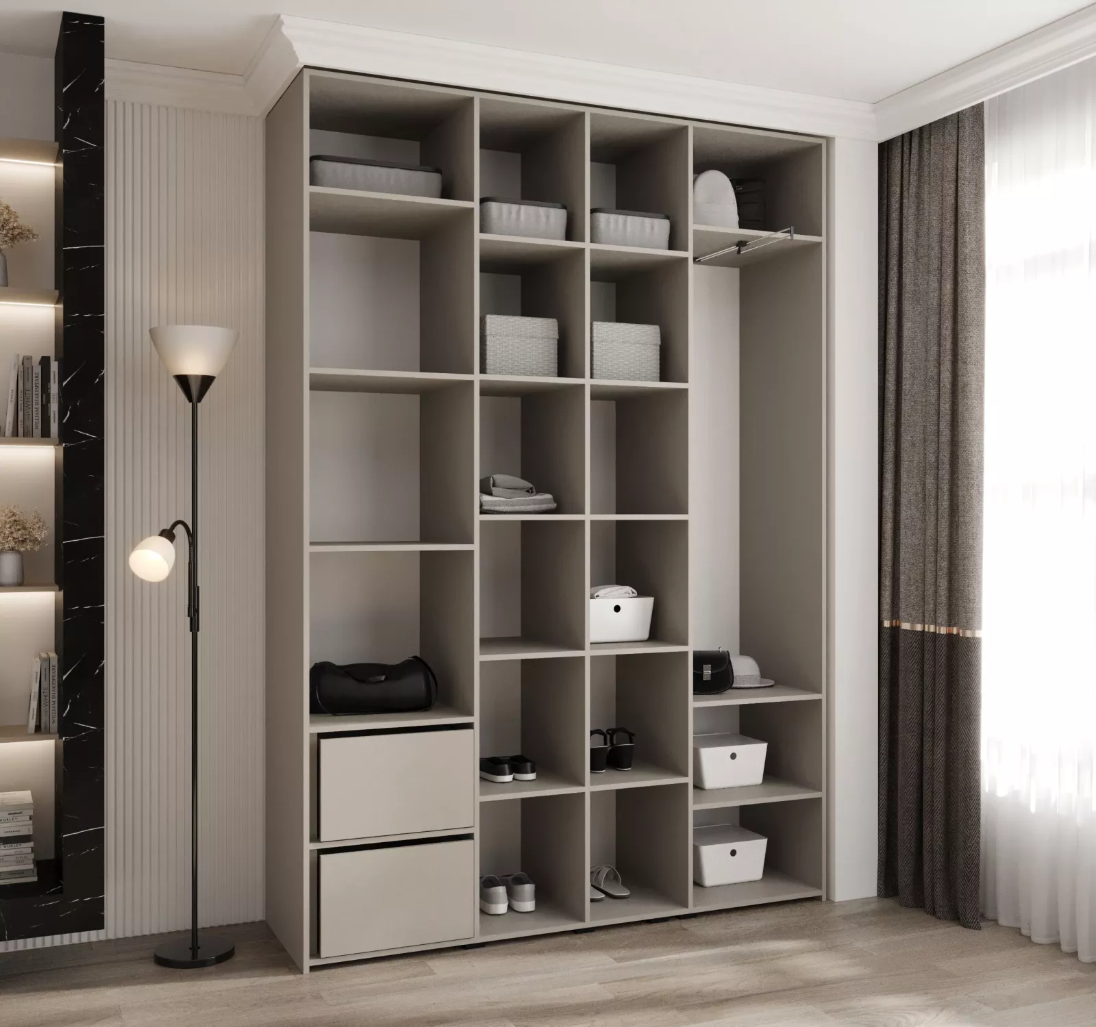 Přídavné šuplíky (včetně pojezdů) a přídavné police vyobrazené na fotografii najdete k dokoupení v sekci Doporučujeme přikoupit. Do skříně je možné nainstalovat 2 sety přídavných šuplíků a 2 sady přídavných polic.