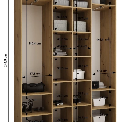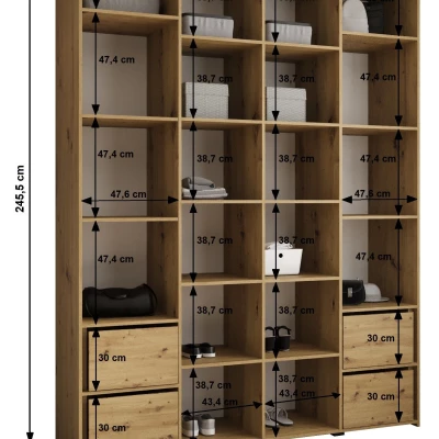 Šatní skříň s policemi LORENA se pyšní svou výškou a menší hloubkou. Využijete tak i malý prostor na maximum. Vnitřní uspořádání je tvořeno policemi a 2 výsuvnými šatními tyčemi. Praktickou součástí dvířek jsou decentní úchyty.