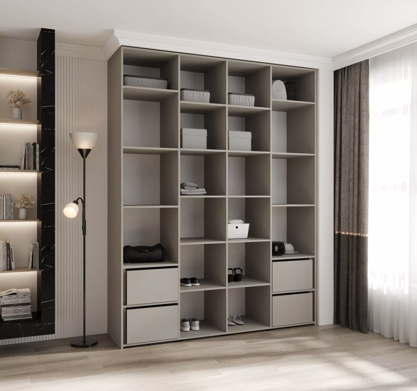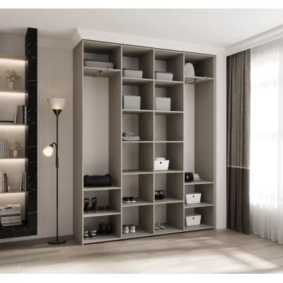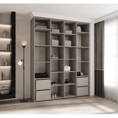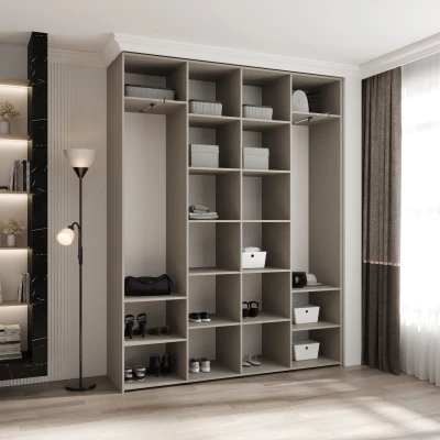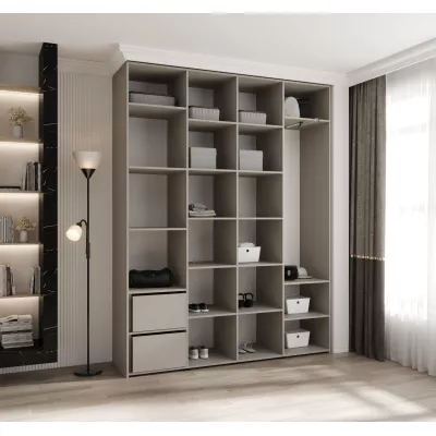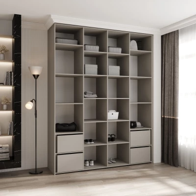Přídavné šuplíky (včetně pojezdů) a přídavné police vyobrazené na fotografii najdete k dokoupení v sekci Doporučujeme přikoupit. Do skříně je možné nainstalovat 2 sety přídavných šuplíků a 2 sady přídavných polic.