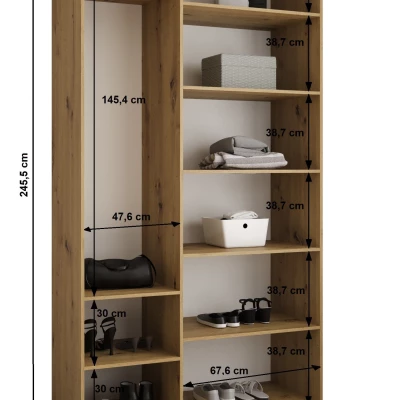 Šatní skříň s policemi LORENA se pyšní svou výškou a menší hloubkou. Využijete tak i malý prostor na maximum. Vnitřní uspořádání je tvořeno policemi a výsuvnou šatní tyčí. Praktickou součástí dvířek jsou decentní úchyty.