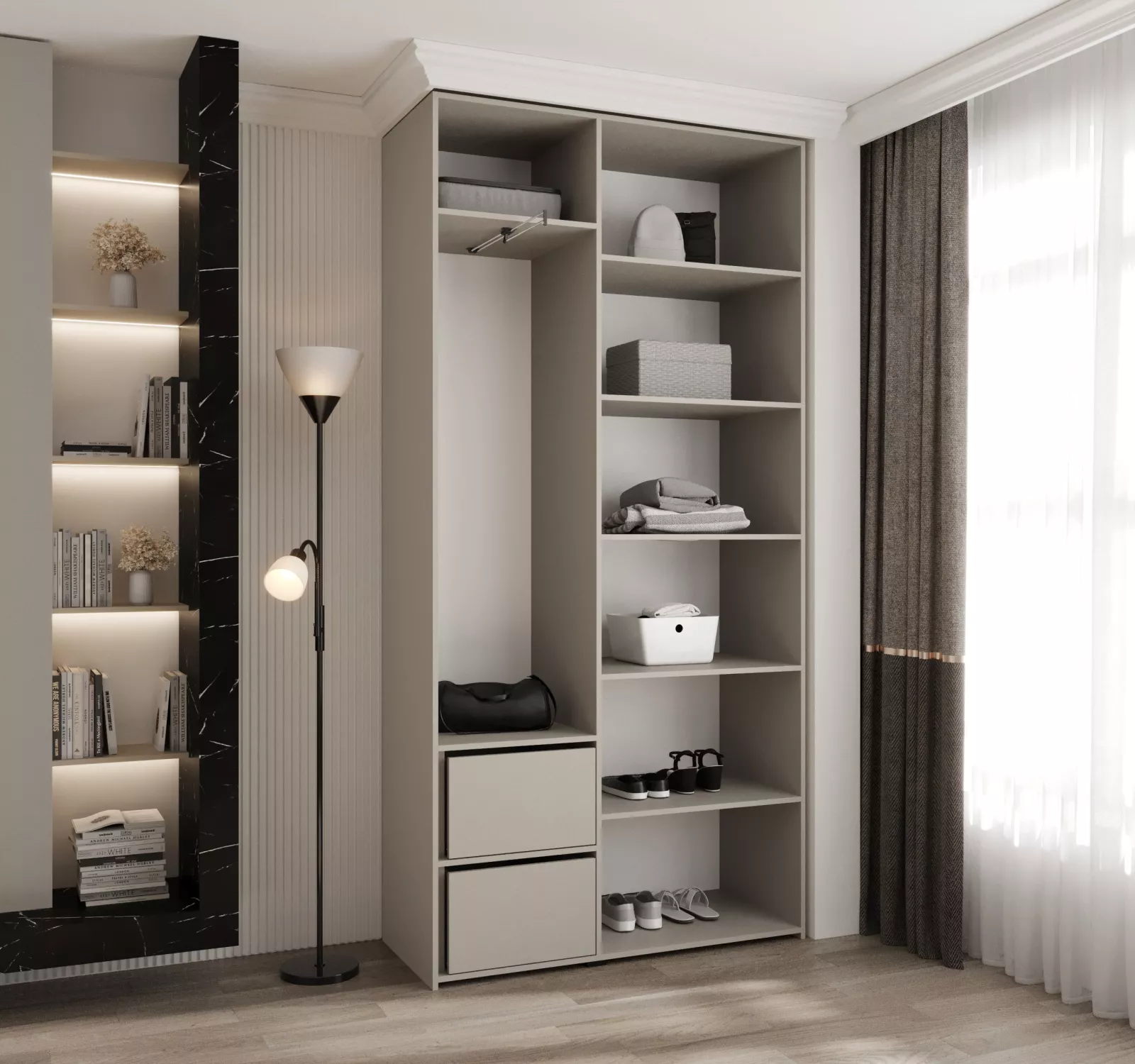 Přídavné šuplíky (včetně pojezdů) a přídavné police vyobrazené na fotografii najdete k dokoupení v sekci Doporučujeme přikoupit. Do skříně je možné nainstalovat 1 set přídavných šuplíků a 1 sadu přídavných polic.
