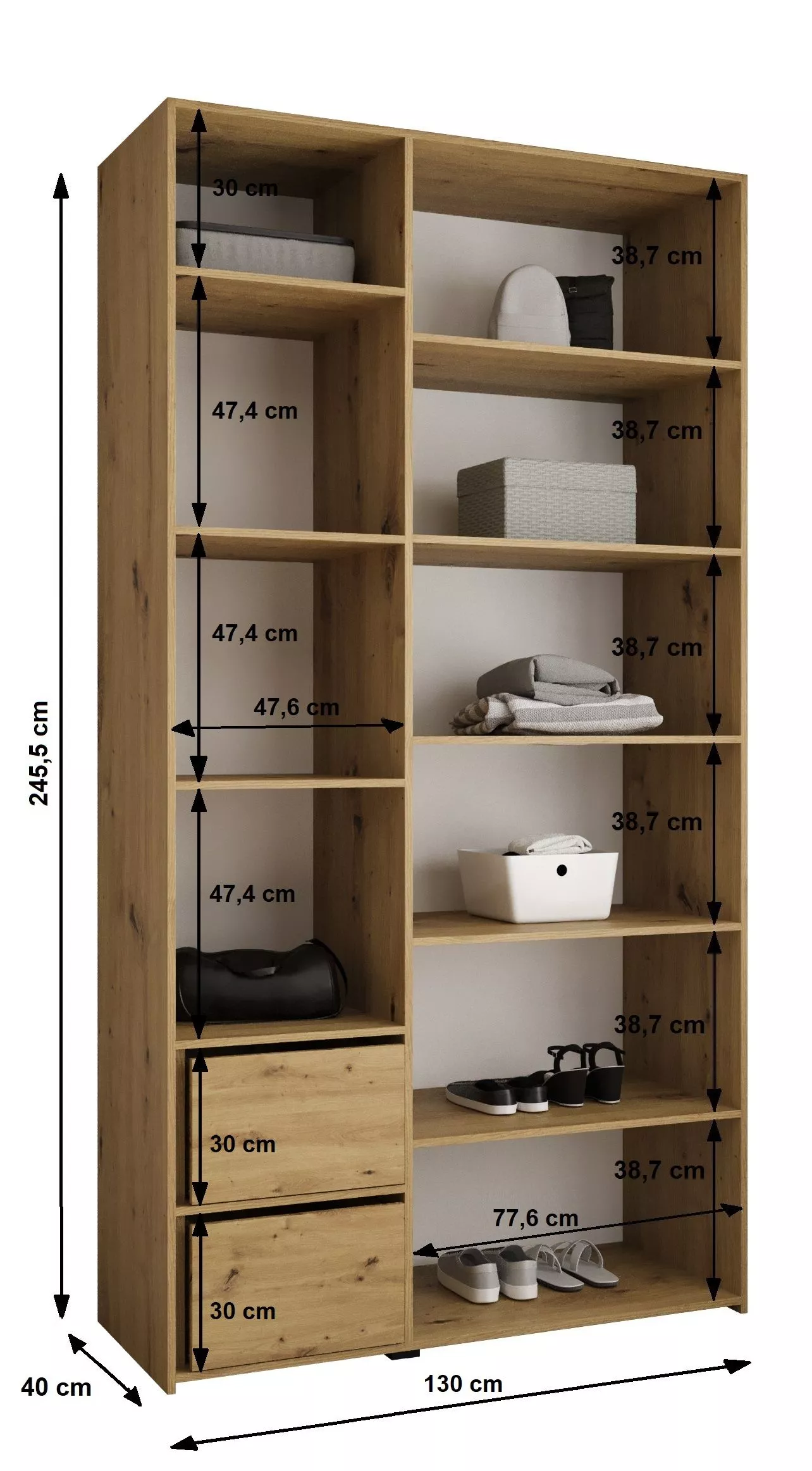 Šatní skříň s policemi LORENA se pyšní svou výškou a menší hloubkou. Využijete tak i malý prostor na maximum. Vnitřní uspořádání je tvořeno policemi a výsuvnou šatní tyčí. Praktickou součástí dvířek jsou decentní úchyty.