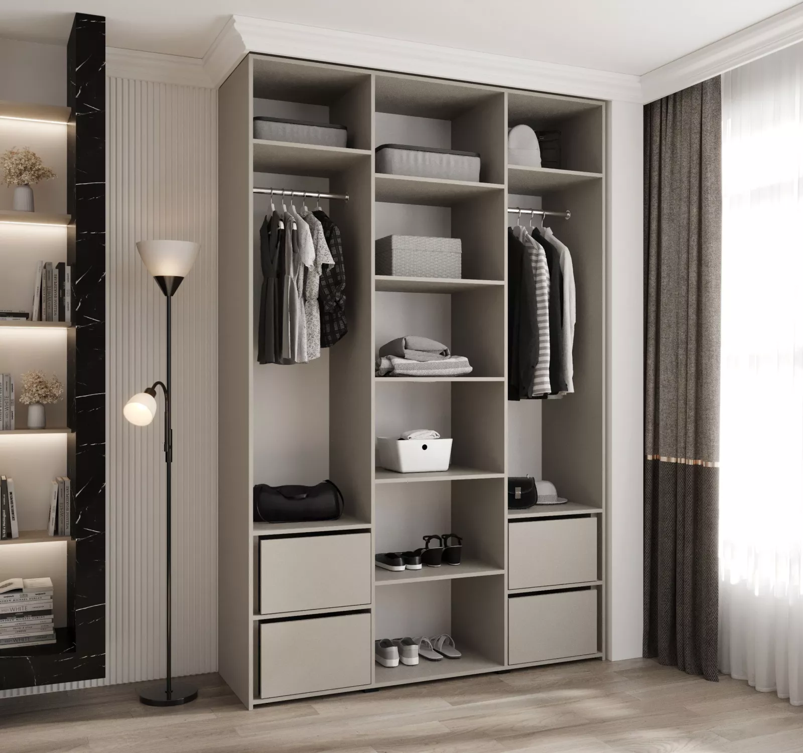 Přídavné šuplíky (včetně pojezdů) a přídavné police vyobrazené na fotografii najdete k dokoupení v sekci Doporučujeme přikoupit. Do skříně je možné nainstalovat 2 sety přídavných šuplíků a 2 sady přídavných polic.