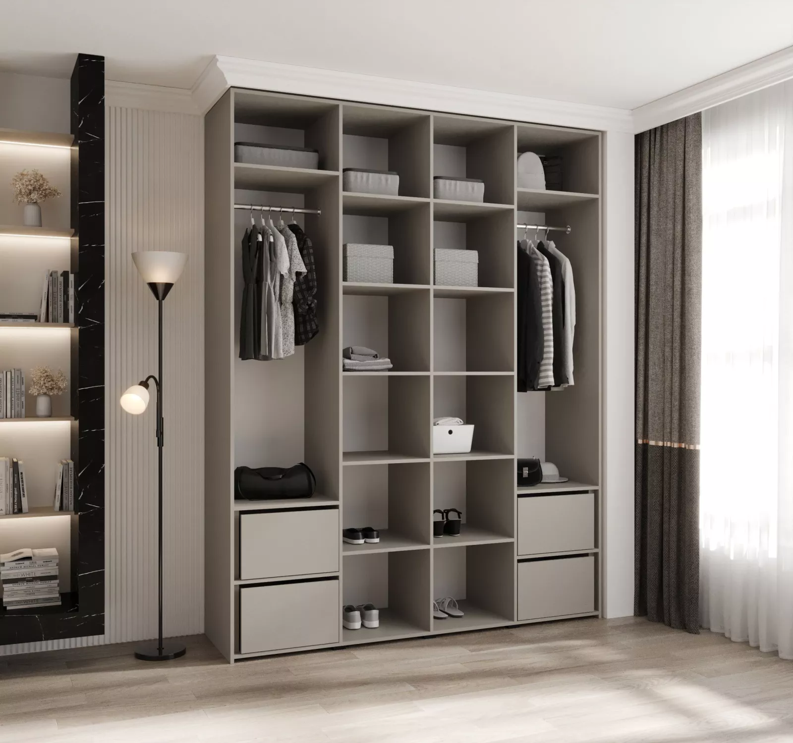 Přídavné šuplíky (včetně pojezdů) a přídavné police vyobrazené na fotografii najdete k dokoupení v sekci Doporučujeme přikoupit. Do skříně je možné nainstalovat 2 sety přídavných šuplíků a 2 sady přídavných polic.