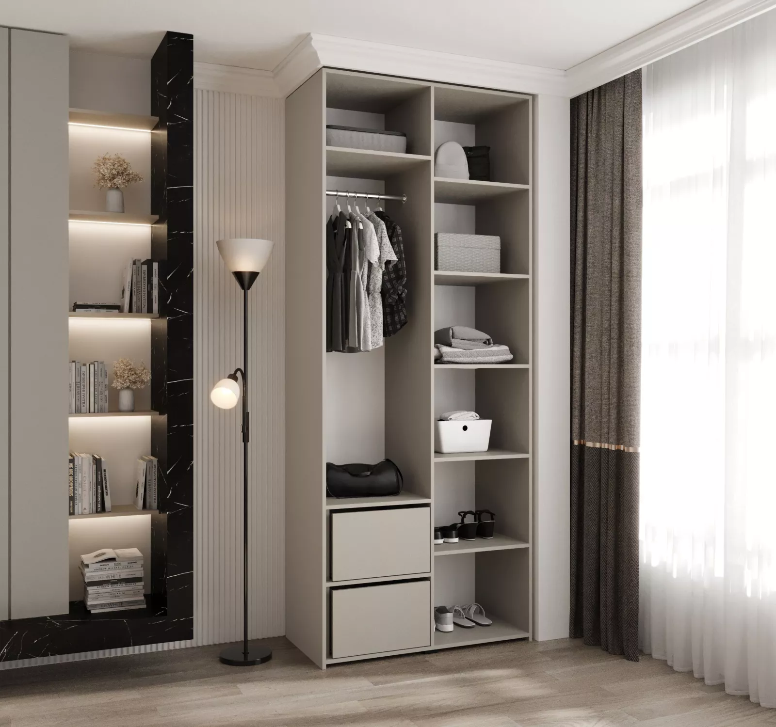 Přídavné šuplíky (včetně pojezdů) a přídavné police vyobrazené na fotografii najdete k dokoupení v sekci Doporučujeme přikoupit. Do skříně je možné nainstalovat 1 set přídavných šuplíků a 1 sadu přídavných polic.