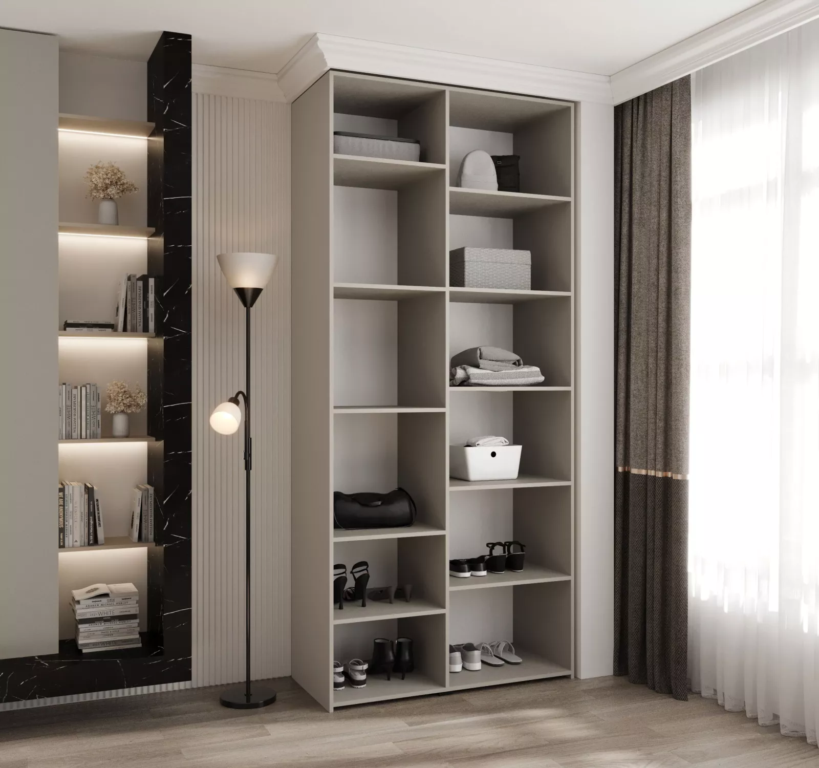 Přídavné šuplíky (včetně pojezdů) a přídavné police vyobrazené na fotografii najdete k dokoupení v sekci Doporučujeme přikoupit. Do skříně je možné nainstalovat 1 set přídavných šuplíků a 1 sadu přídavných polic.
