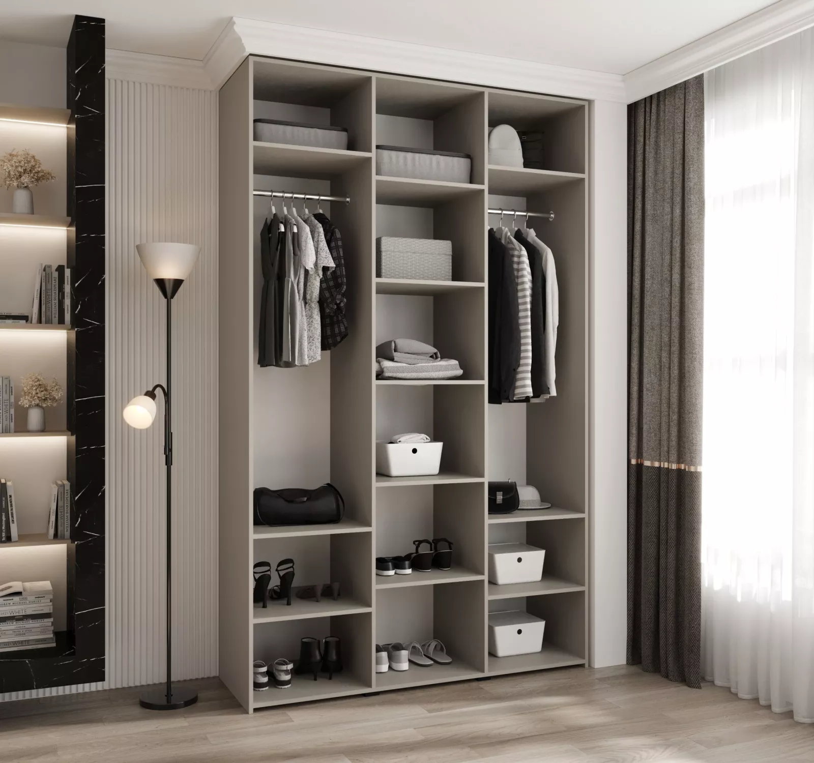 Šatní skříň s policemi LORENA se pyšní svou výškou a menší hloubkou. Využijete tak i malý prostor na maximum. Vnitřní uspořádání je tvořeno policemi a 2 šatními tyčemi. Praktickou součástí dvířek jsou decentní úchyty.