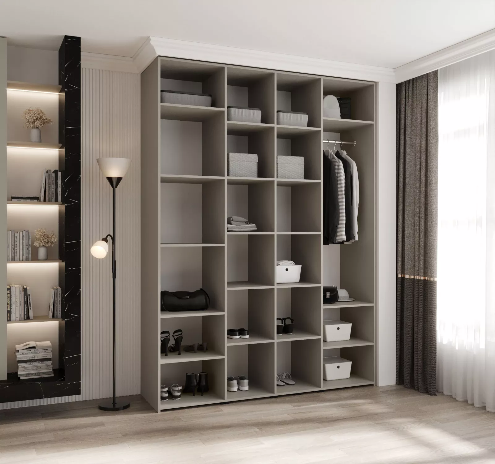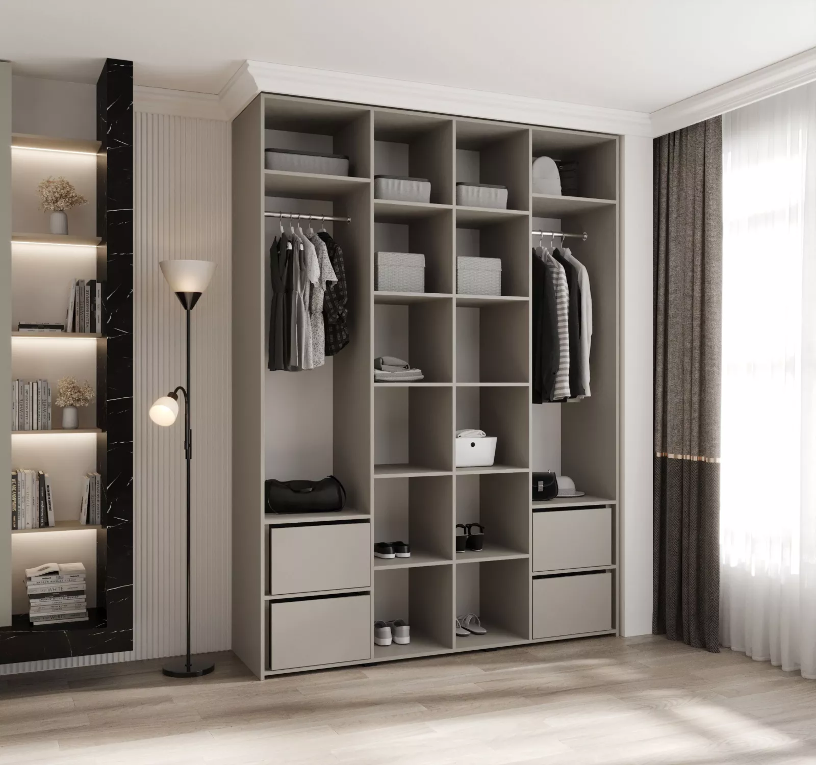 Přídavné šuplíky (včetně pojezdů) a přídavné police vyobrazené na fotografii najdete k dokoupení v sekci Doporučujeme přikoupit. Do skříně je možné nainstalovat 2 sety přídavných šuplíků a 2 sady přídavných polic.