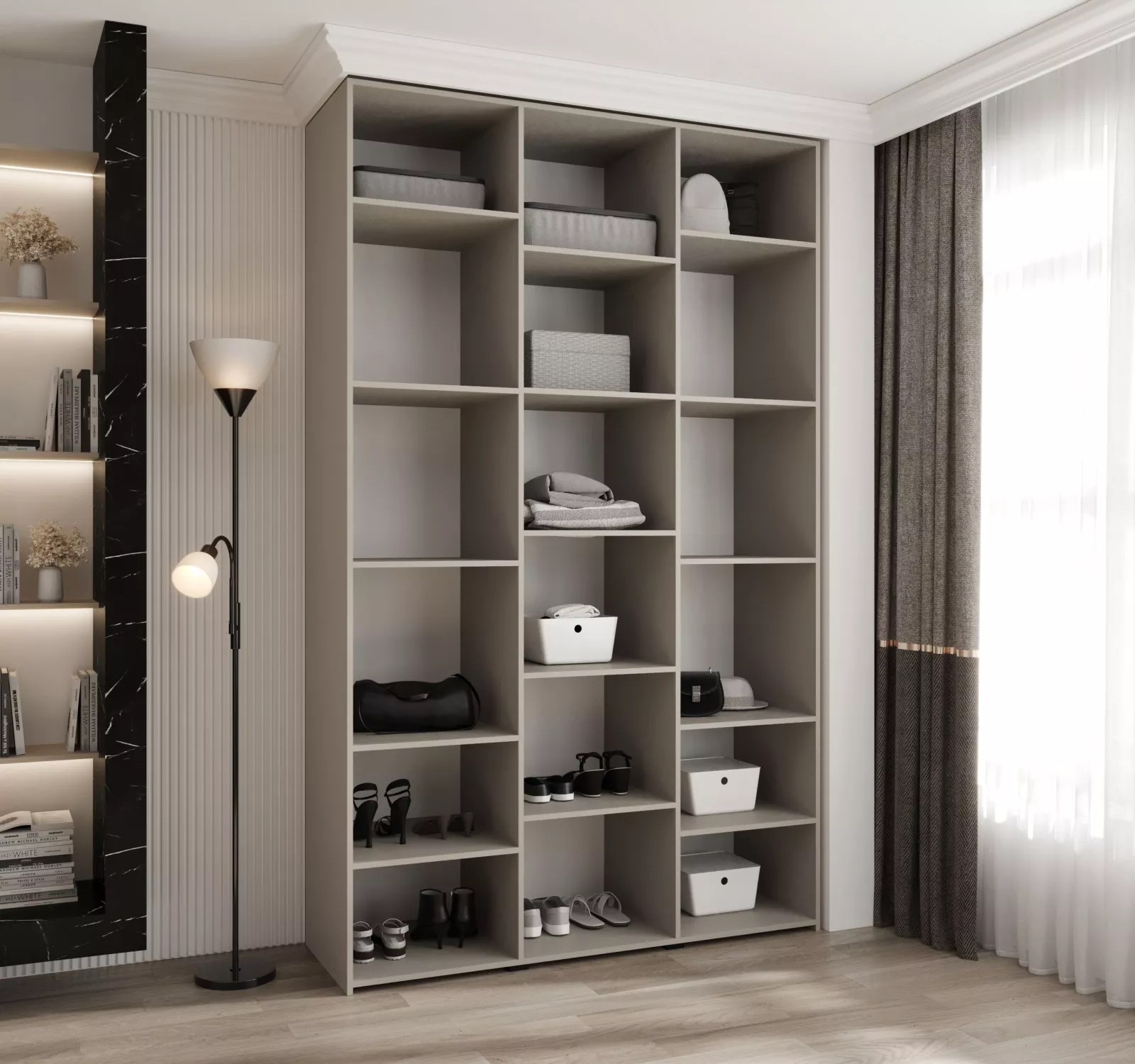 Šatní skříň s policemi LORENA se pyšní svou výškou a menší hloubkou. Využijete tak i malý prostor na maximum. Vnitřní uspořádání je tvořeno policemi a 2 šatními tyčemi. Praktickou součástí dvířek jsou decentní úchyty.