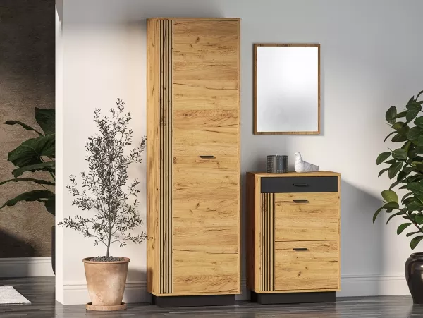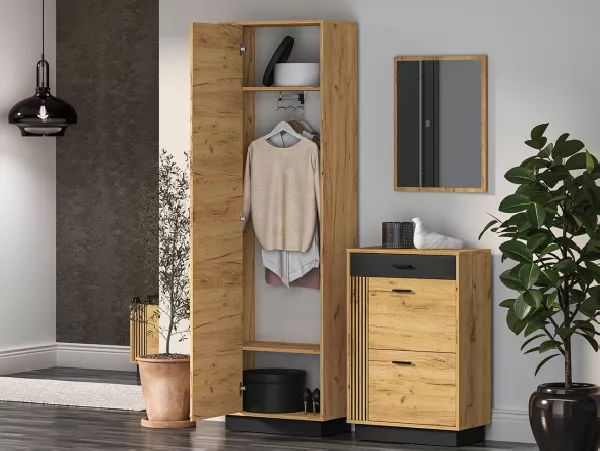 Šatní skříň FAZA nabízí dostatek prostoru pro úschovu oblečení, obuvi i módních doplňků. Skříň je vybavena šatní tyčí a policí.