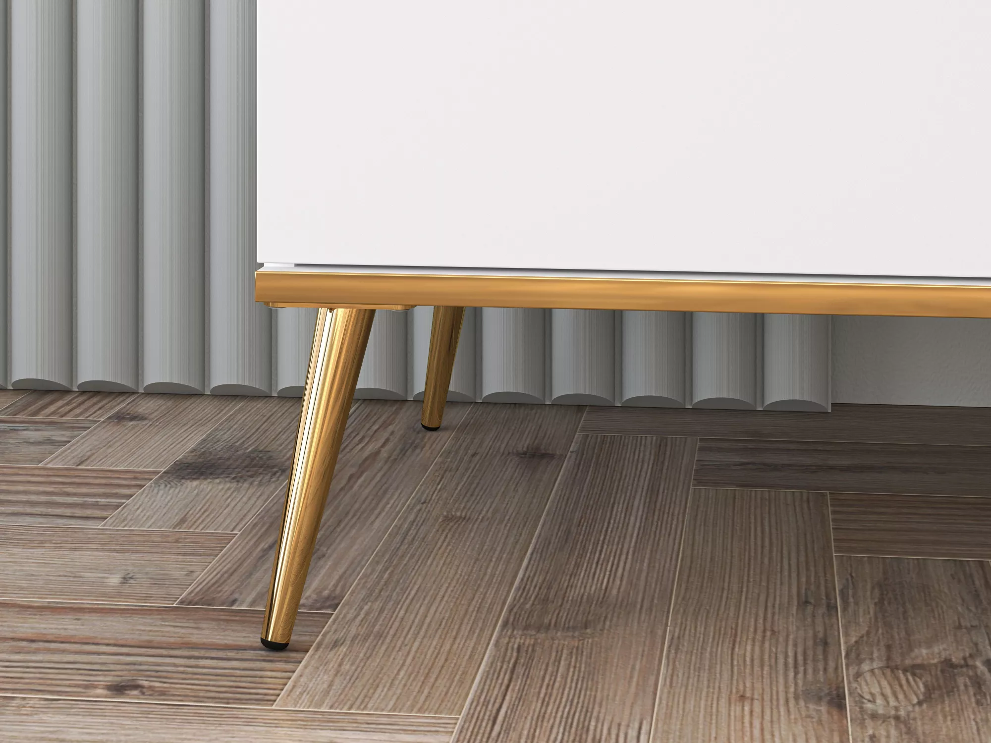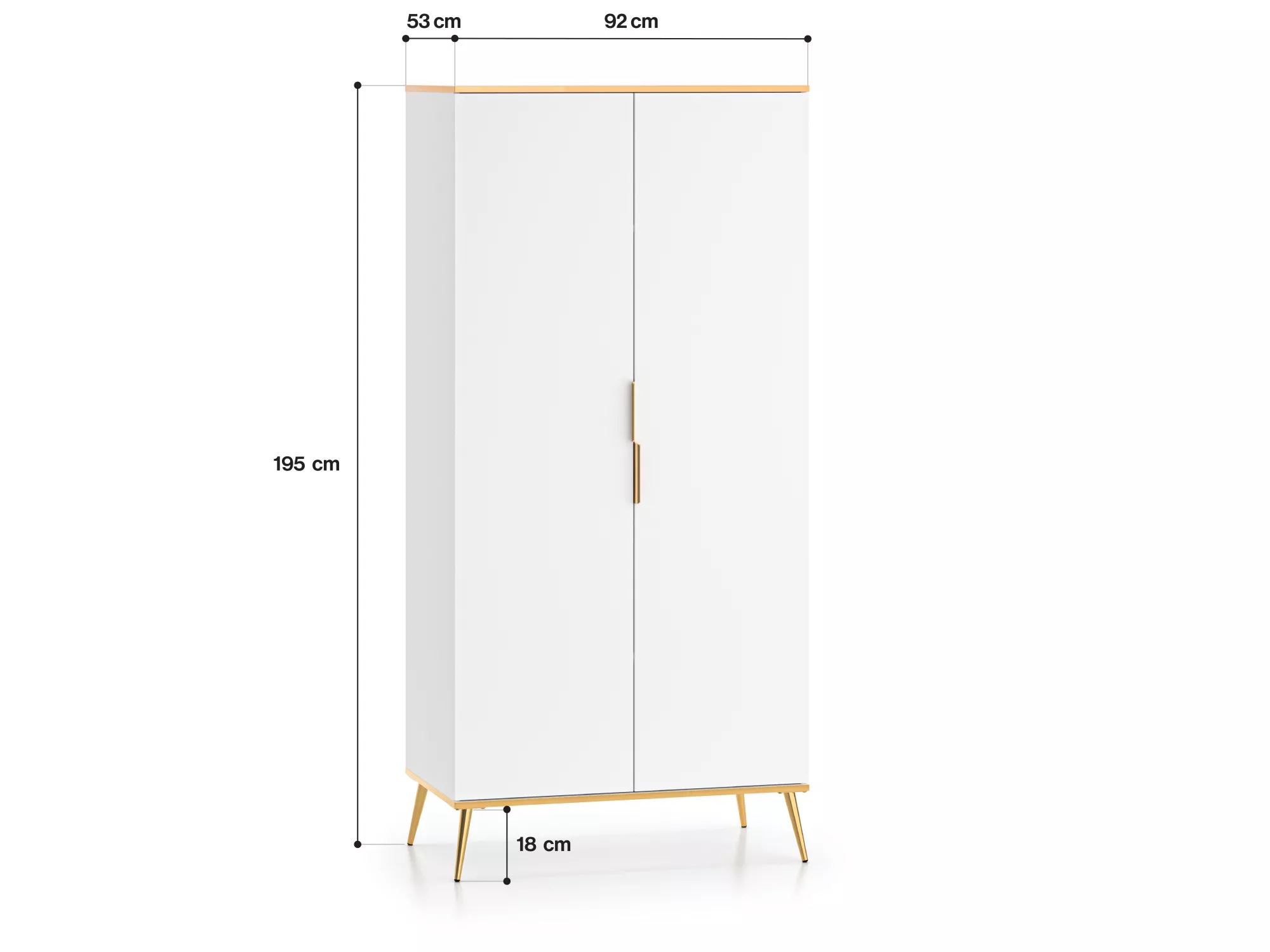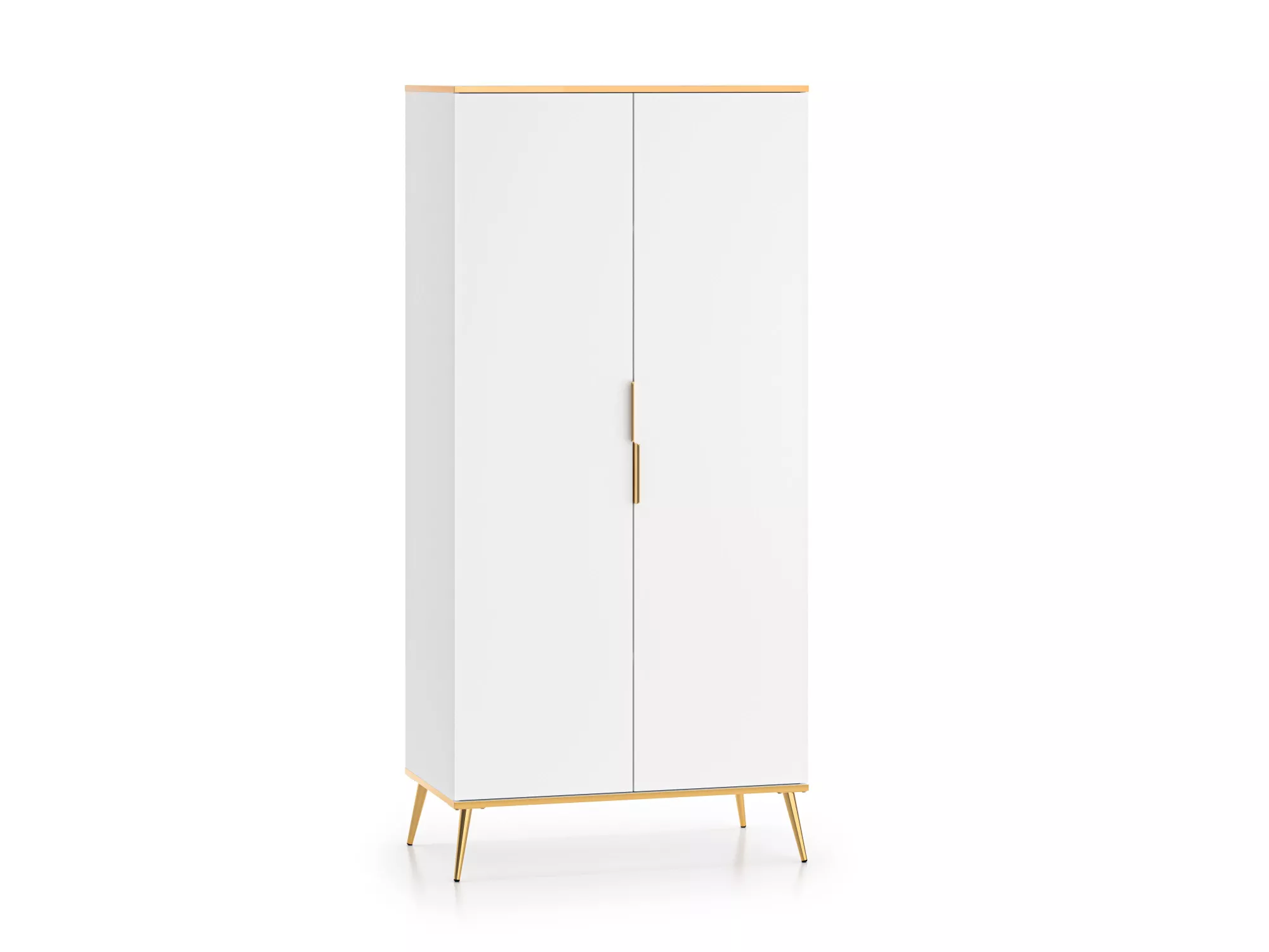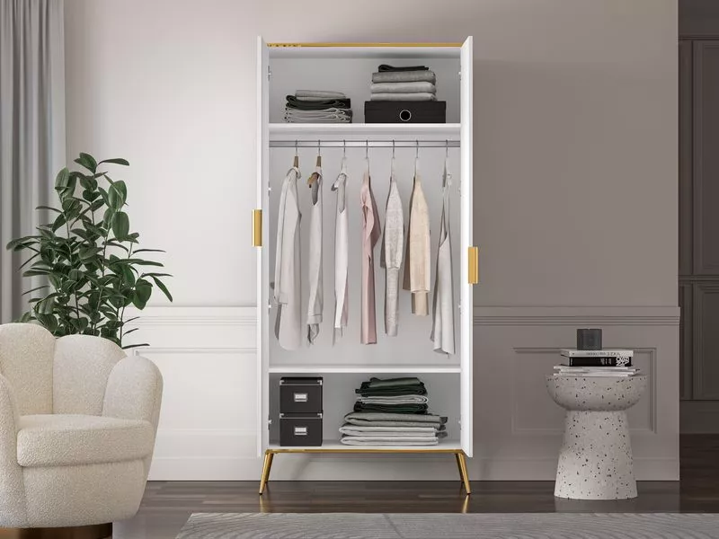 Šatní skříň SICIA elegantního vzhledu v kombinaci se zlatými nožkami a úchyty dokonale zapadne do moderních interiérů. Nabízí dostatek prostoru pro úschovu oblečení, obuvi i módních doplňků. Skříň je vybavena šatní tyčí a policí.
