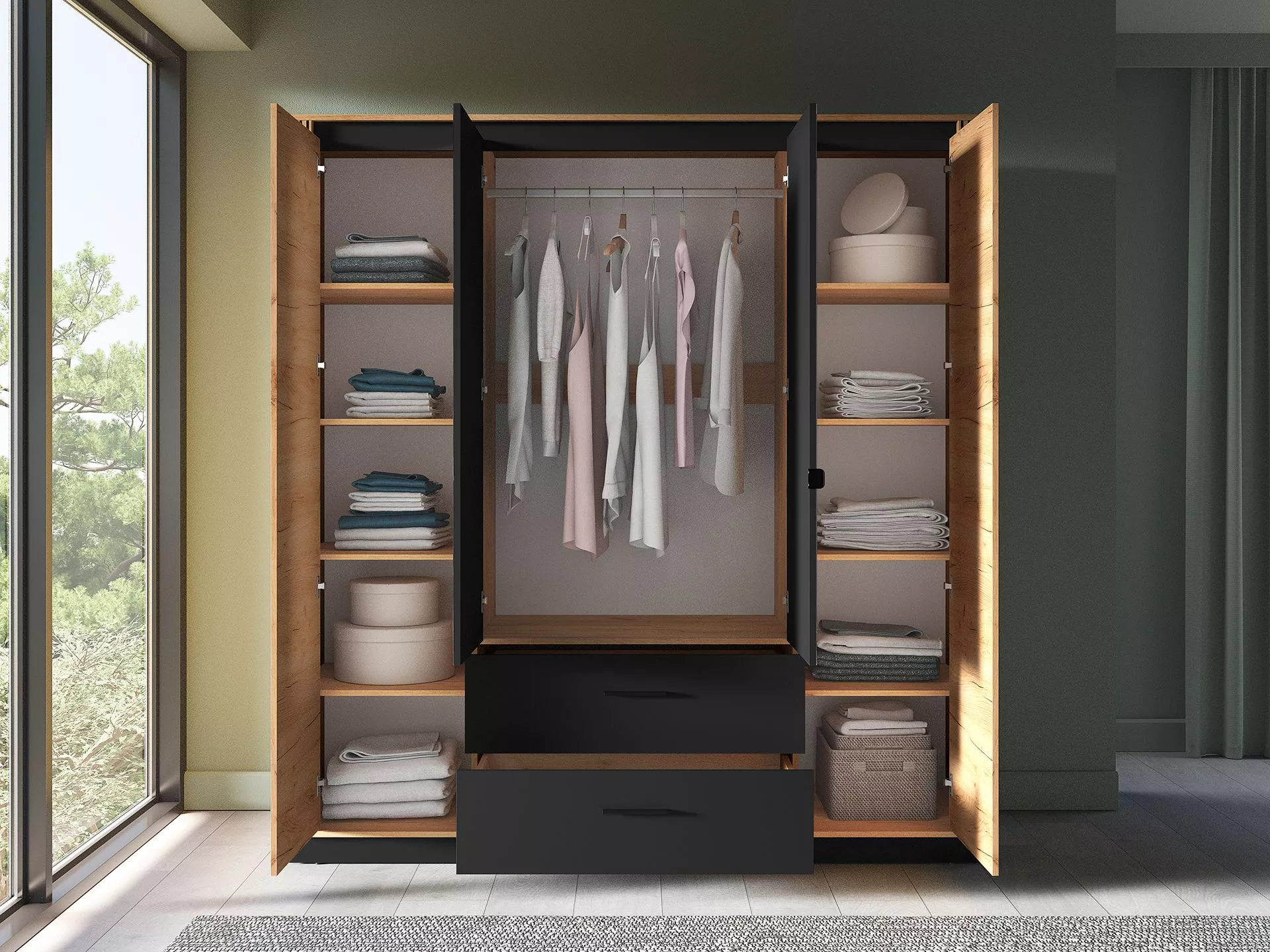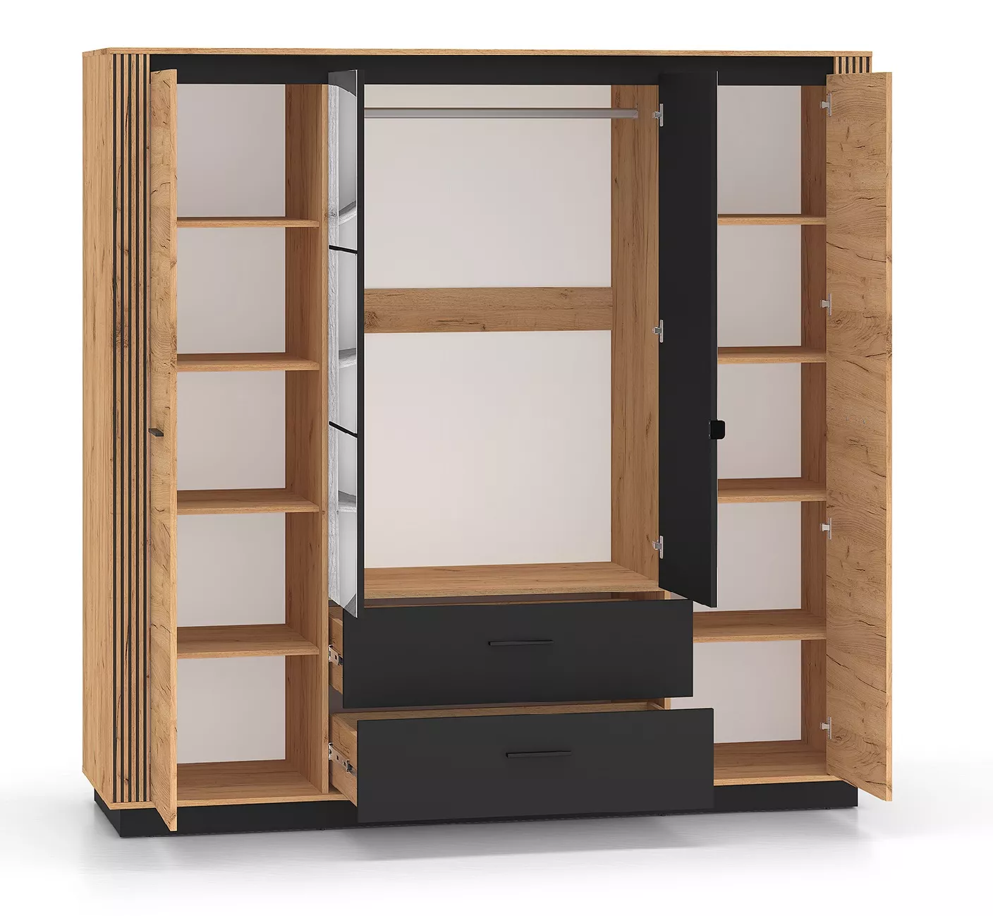 Čtyřdvéřová šatní skříň MING disponuje velkým množstvím úložného prostoru a zrcadlem. Skříň má 8 polic, 2 prostorné šuplíky a šatní tyč k uložení vašeho oblečení a módních doplňků.