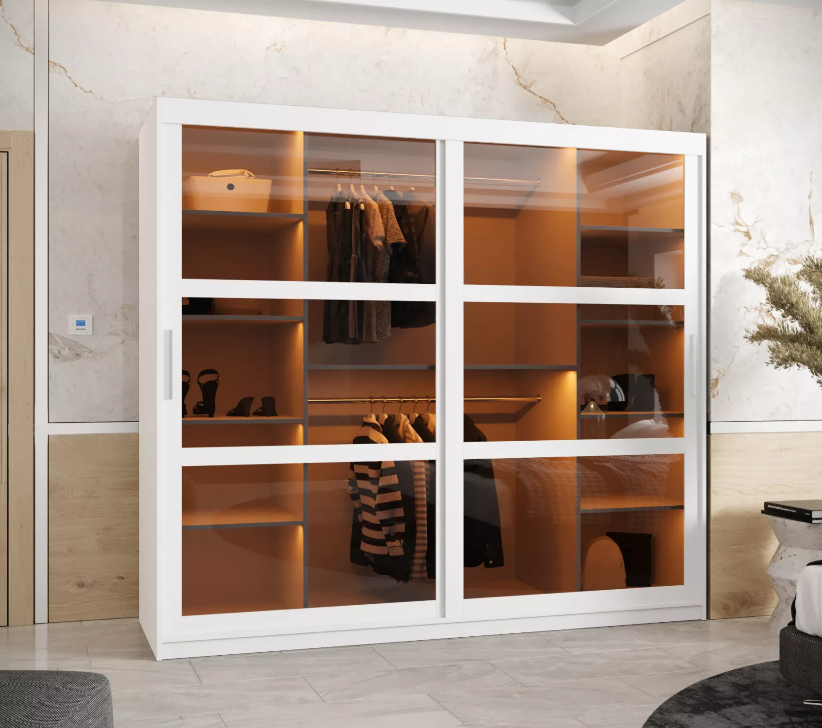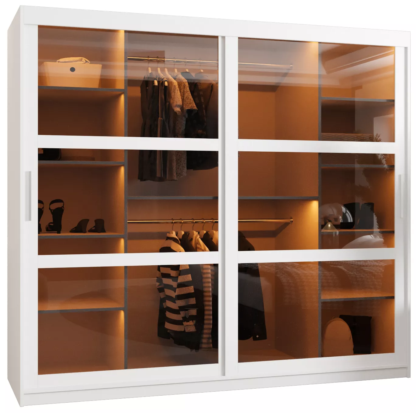Šatní skříň KATIE 3 se hodí do všech moderních ložnic či šatníků. Vnitřek skříně je vybaven policovým systémem a 2 šatními tyčemi.