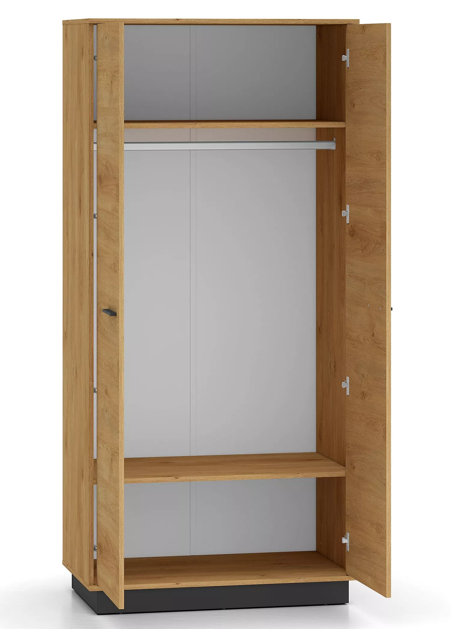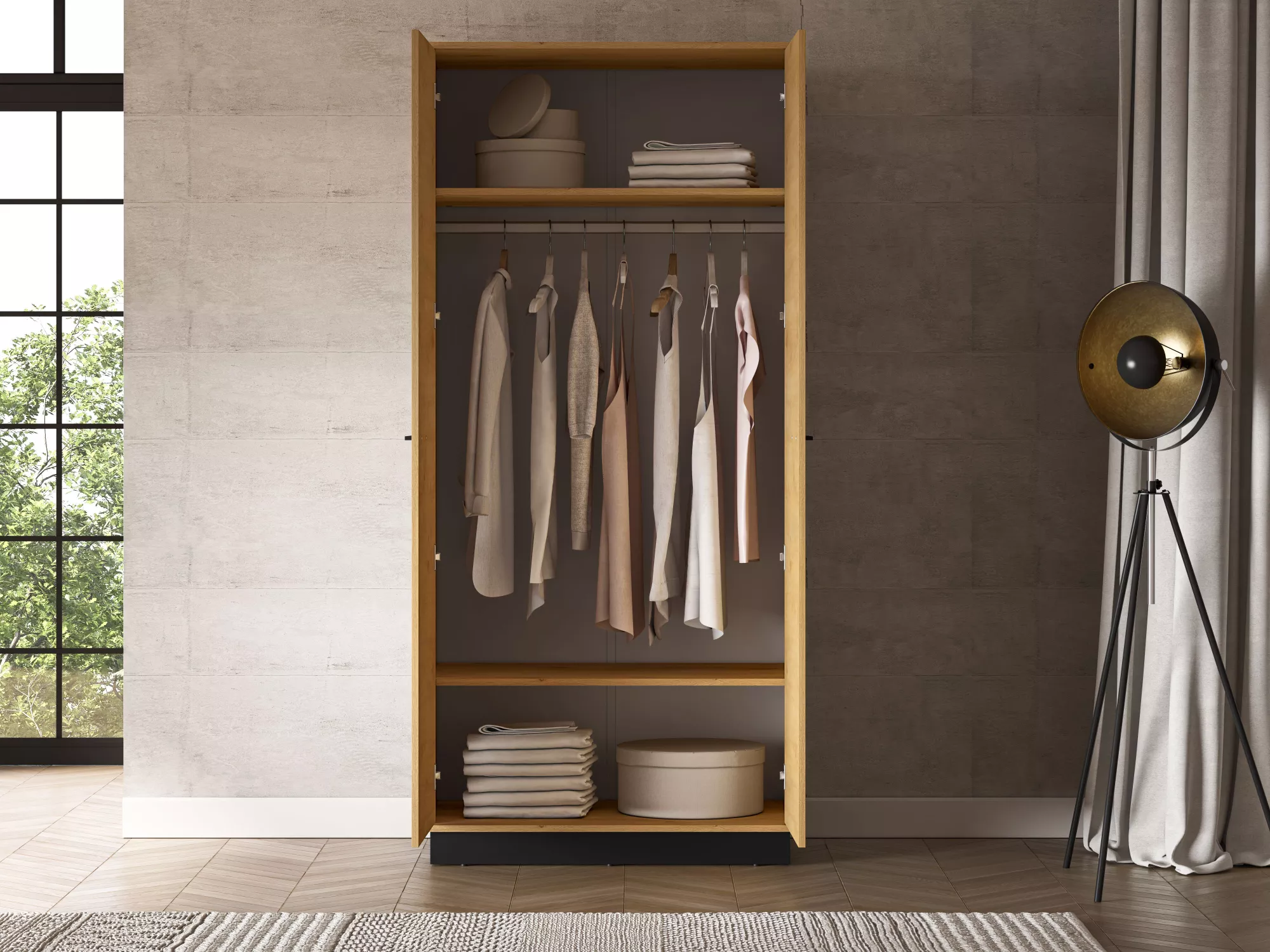 Šatní skříň 92 cm ALYX zaujme svým moderním designem. Nabízí dostatek prostoru pro úschovu oblečení, obuvi i módních doplňků. Skříň je vybavena šatní tyčí a policemi.