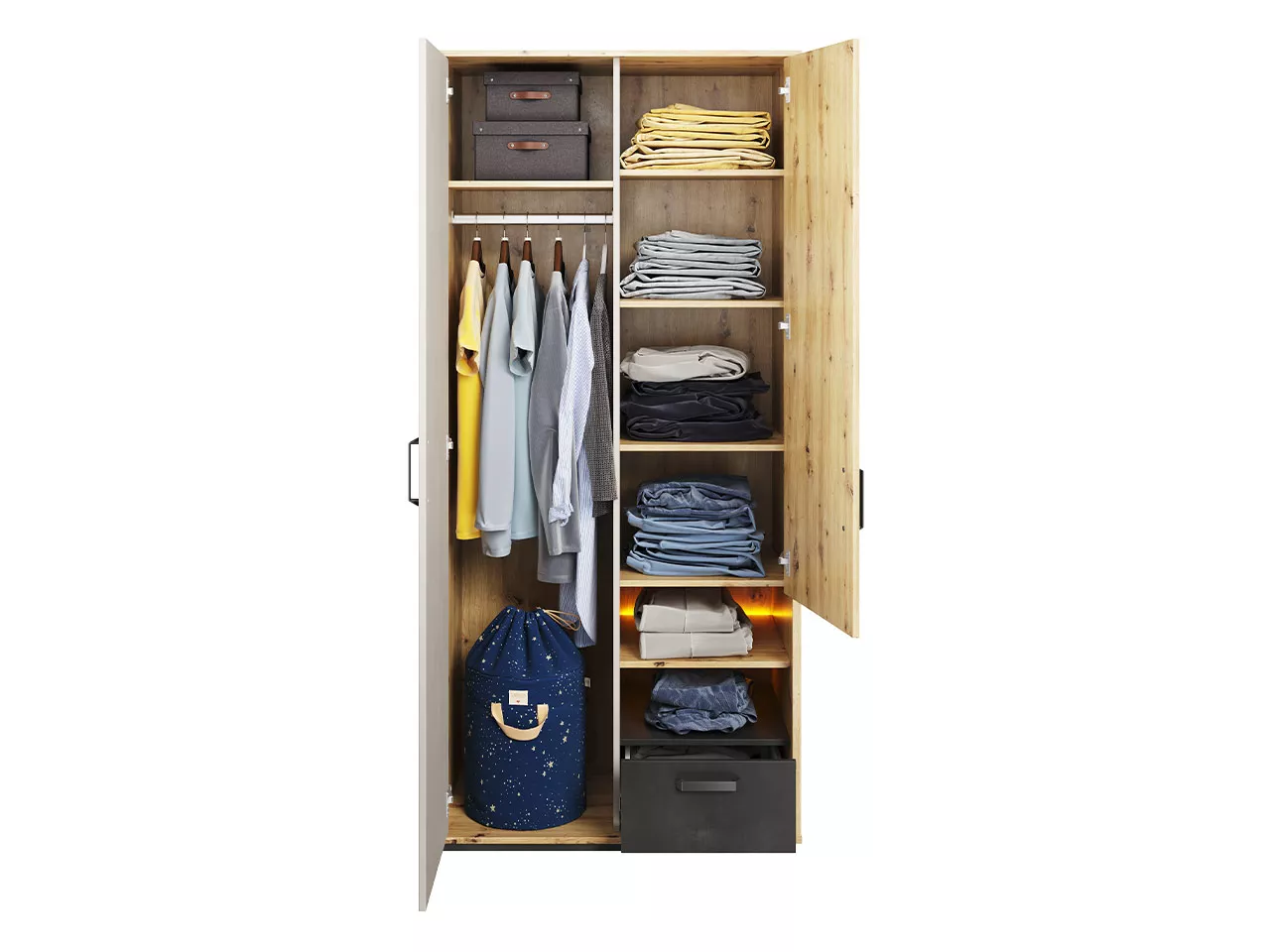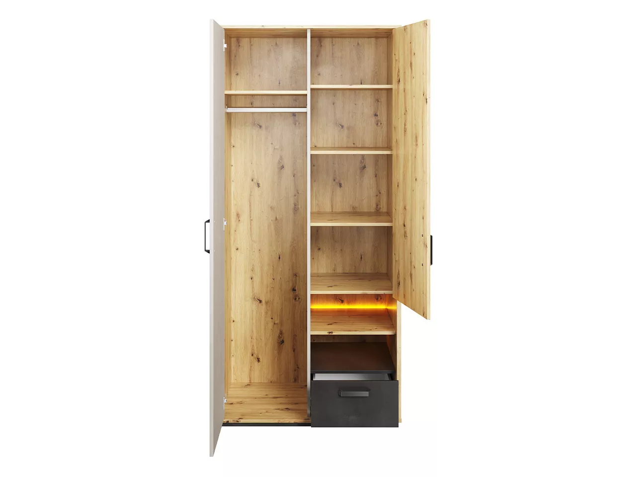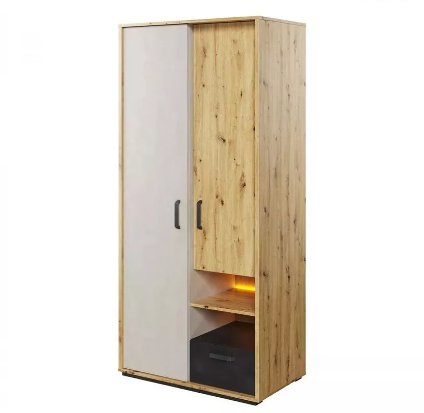 Šatní skříň APTOS přináší moderní a praktické řešení nejen pro vaši ložnici, ale také bude dobře sloužit v předsíni či studentském pokoji. Široké police, šuplík a šatní tyč nabízejí dostatek prostoru pro veškeré vaše oblečení. Osvětlená police navíc dodá úžasnou atmosféru.