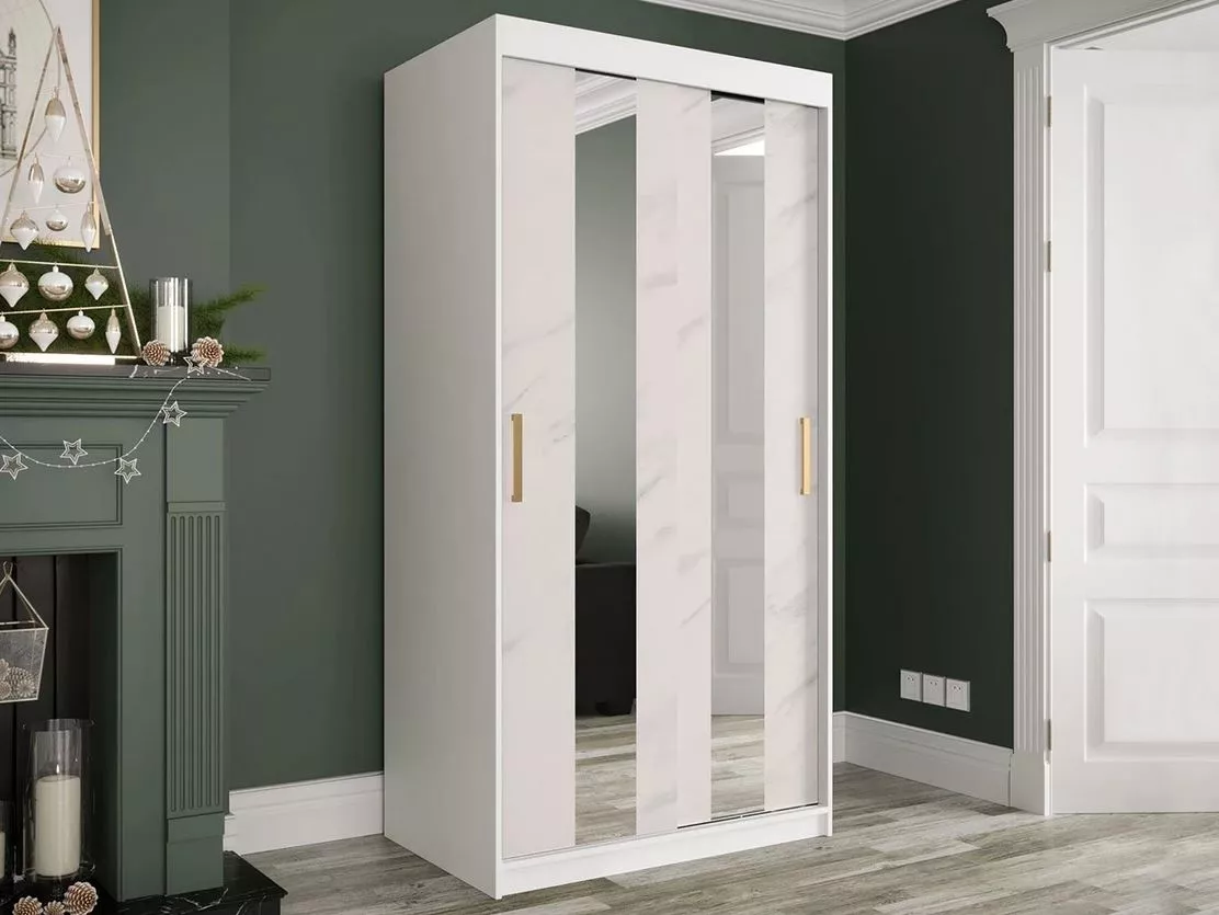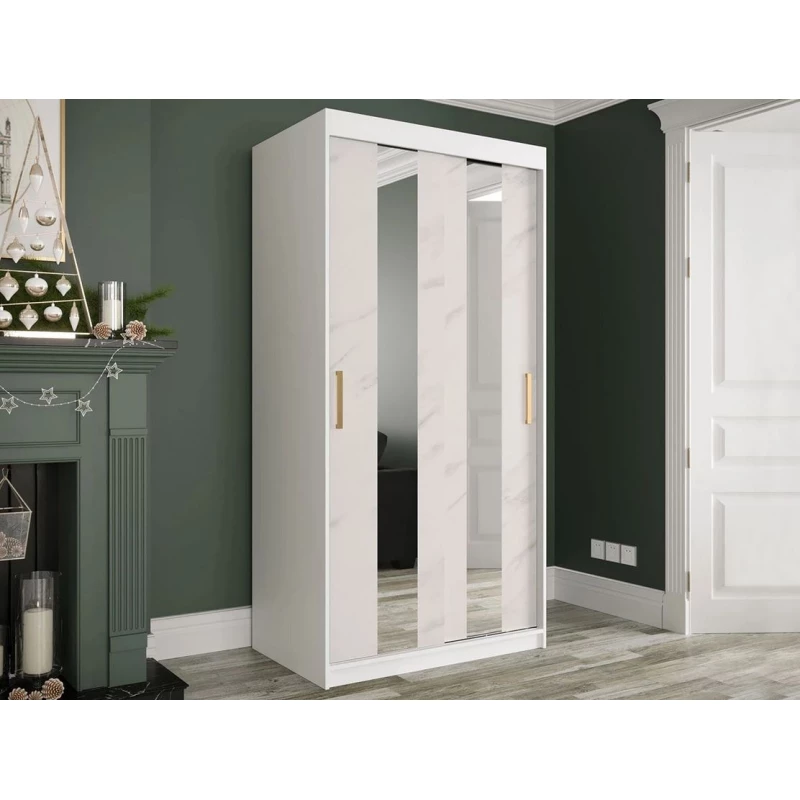 Úzká šatní skříň 100 cm se zrcadlem CARSON 1 - bílý mramor / bílá / zlatá