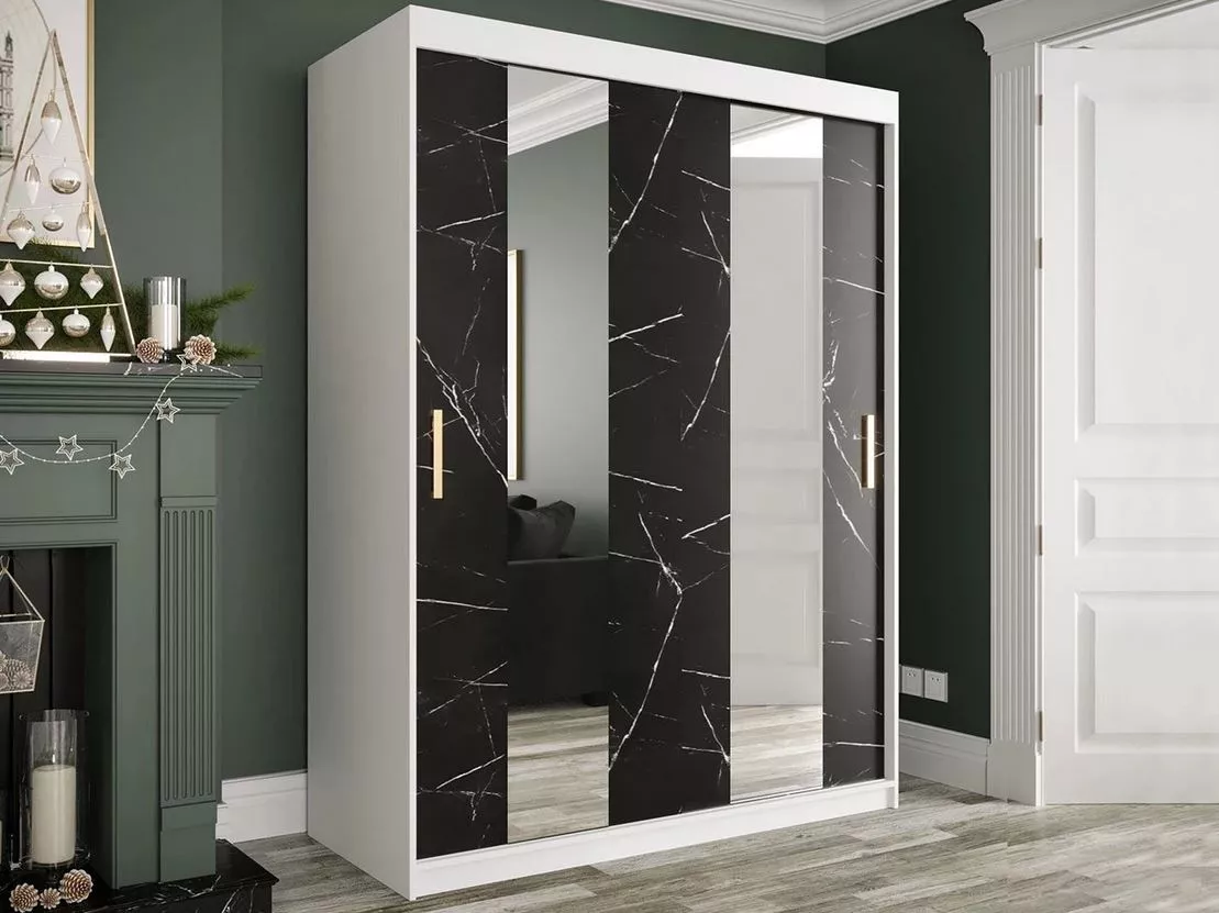 Šatní skříň 150 cm se zrcadlem CARSON 1 - černý mramor / bílá / zlatá