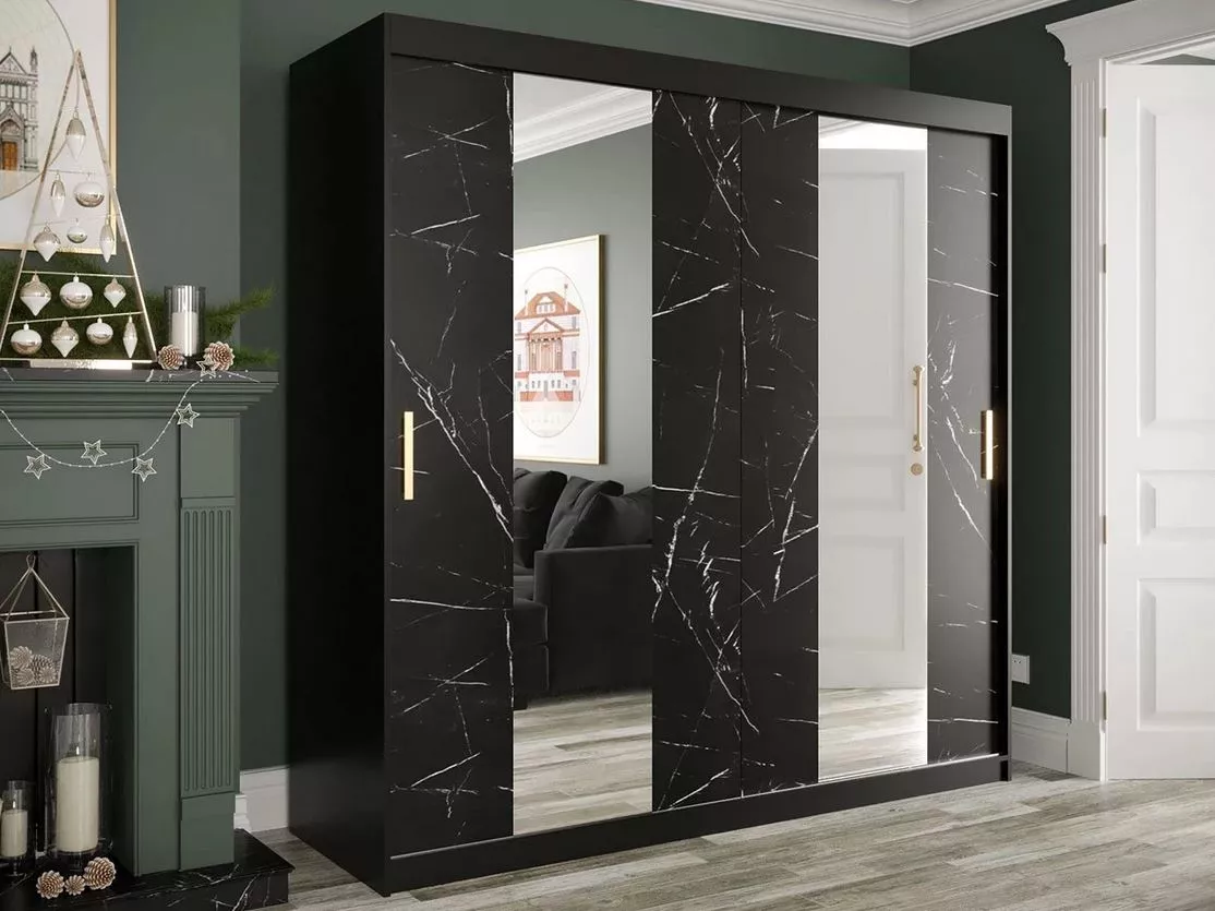 Šatní skříň 200 cm se zrcadlem CARSON 1 - černý mramor / černá / zlatá