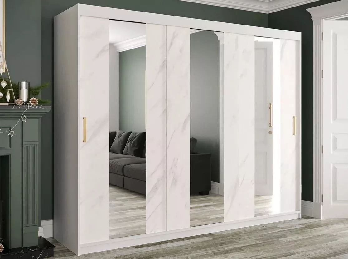 Šatní skříň 250 cm se zrcadlem CARSON 1 - bílý mramor / bílá / zlatá