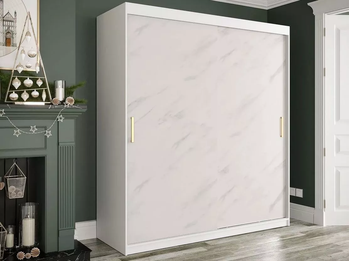 Moderní šatní skříň 180 cm CARSON 2 - bílý mramor / bílá / zlatá