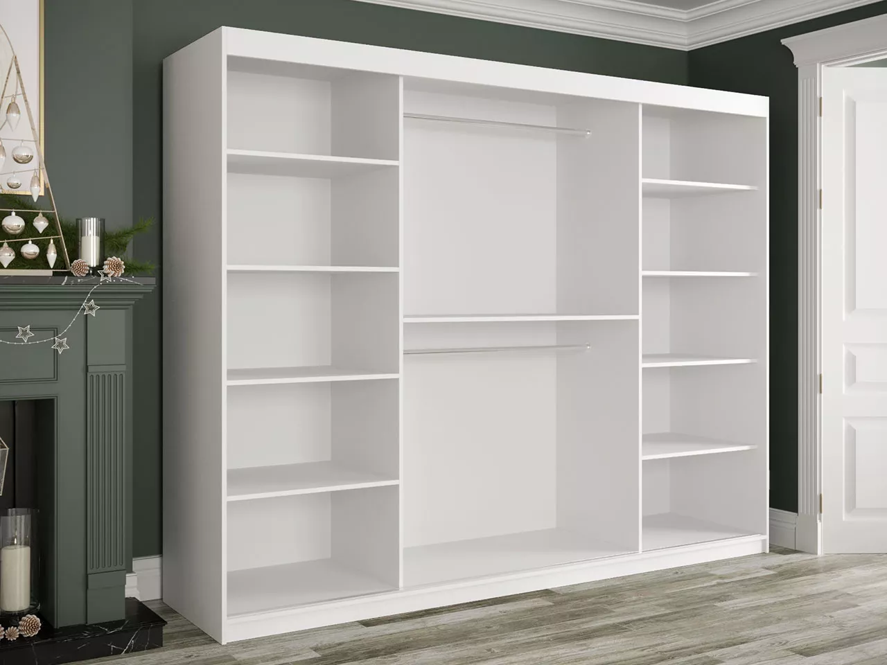 Hledáte funkční a stylovou šatní skříň? Model CARSON se 2 šatními tyčemi na zavěšení svrchního oblečení a praktickými hlubokými policemi splní vaše očekávání. Výška 200 cm umožňuje pohodlně ukládat i dlouhé šaty nebo kabáty, zatímco police poskytují prostor pro složené oblečení.
