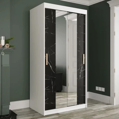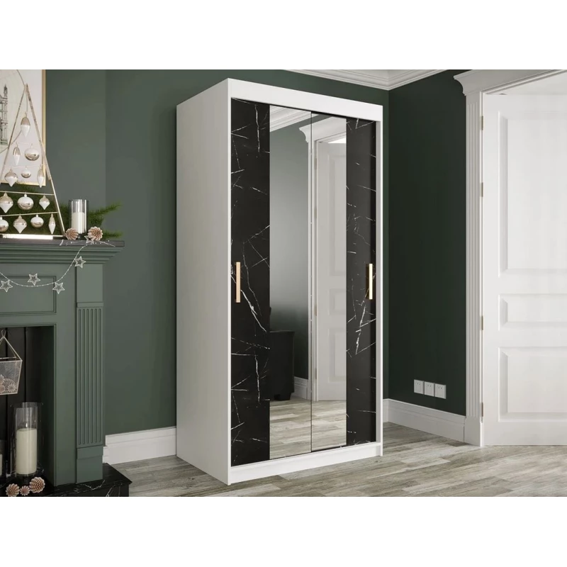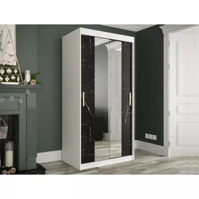 Úzká šatní skříň 100 cm se zrcadlem CARSON 3 - černý mramor / bílá / zlatá