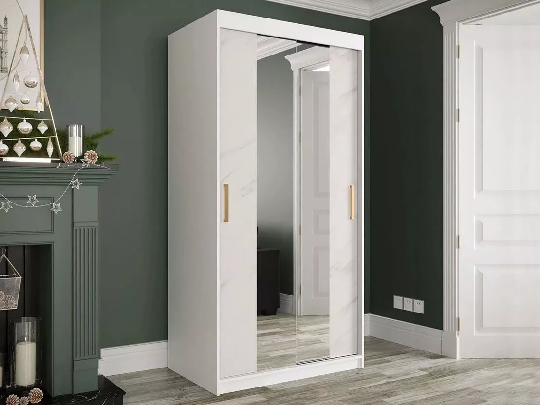 Úzká šatní skříň 100 cm se zrcadlem CARSON 3 - bílý mramor / bílá / zlatá
