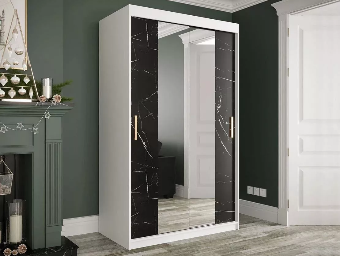 Úzká šatní skříň 120 cm se zrcadlem CARSON 3 - černý mramor / bílá / zlatá