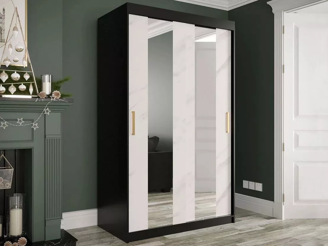 Úzká šatní skříň 120 cm se zrcadlem CARSON 4 - bílý mramor / černá / zlatá