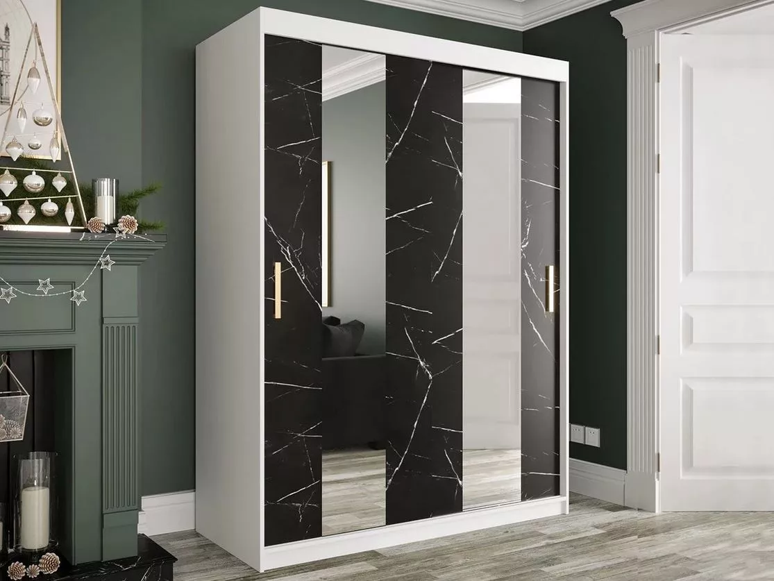 Šatní skříň 150 cm se zrcadlem CARSON 4 - černý mramor / bílá / zlatá